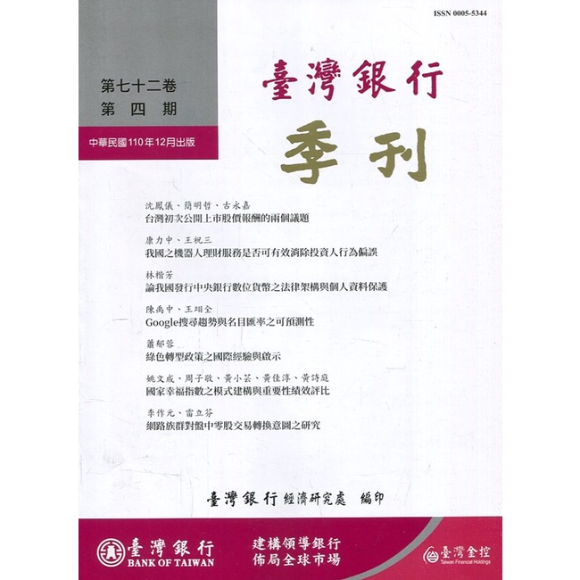 台灣銀行季刊第72卷第4期110/12 臺灣銀行經濟研究處 台灣銀行台灣經濟研究室 繁體中文 五南文化廣場 政府出版品
