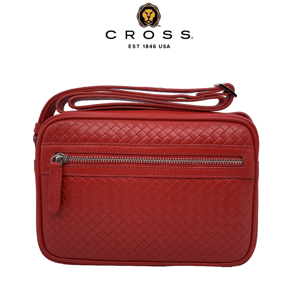 【CROSS】頂級 NAPPA 小牛皮 編織紋 拉鍊 斜背包 (紅色)