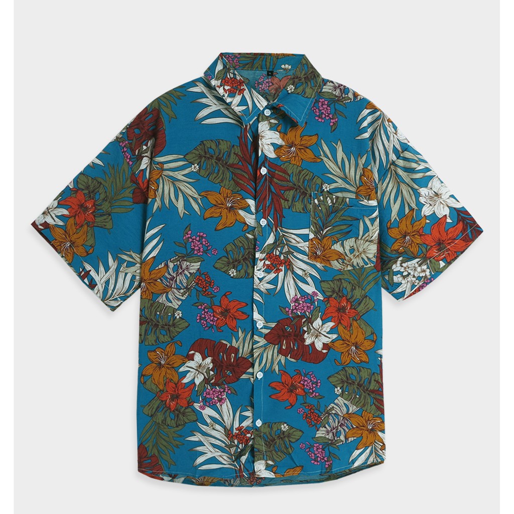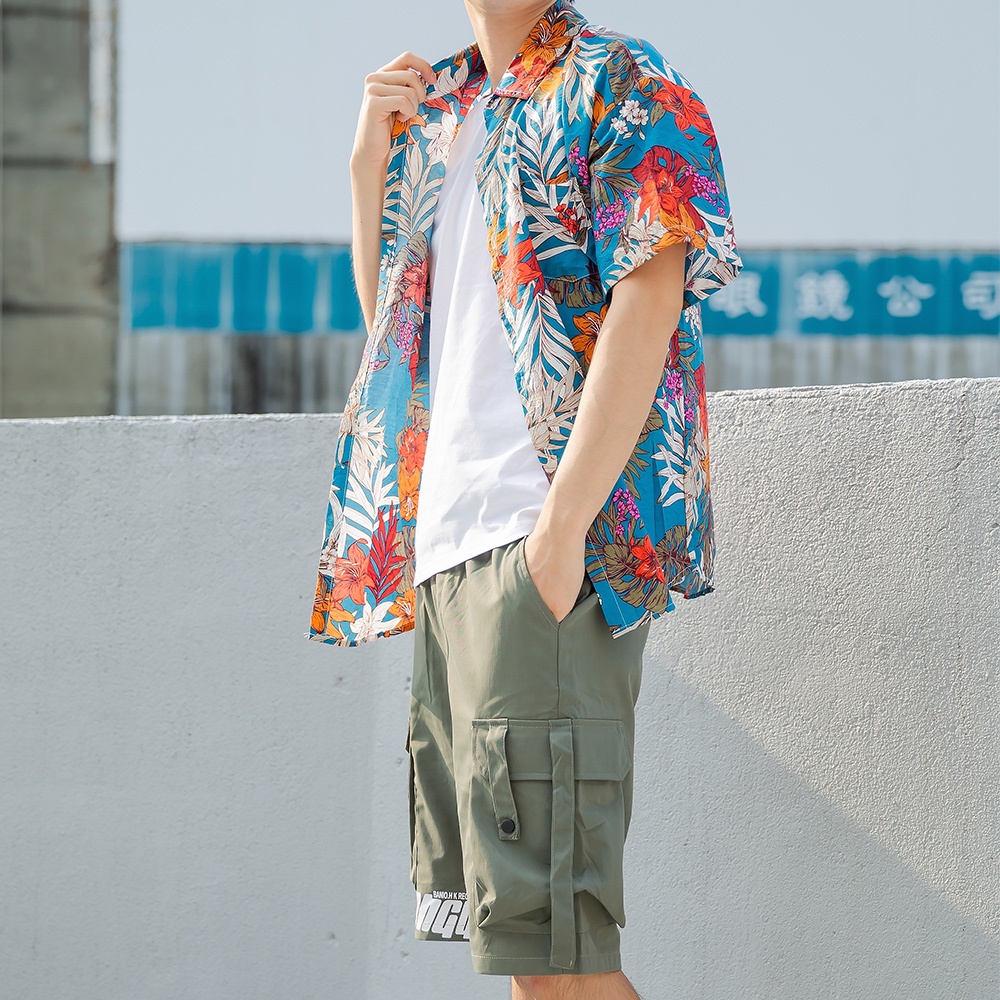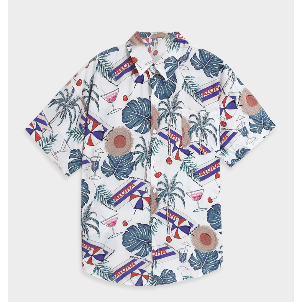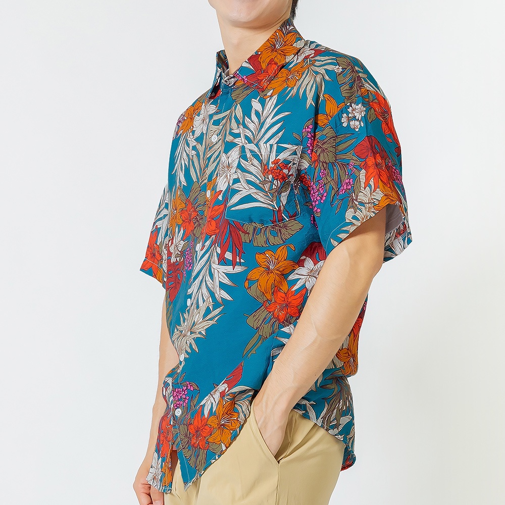 【快速出貨】現貨 輕薄夏日海灘滿版襯衫 滿版花葉 短袖襯衫 花襯衫 痞子襯衫 落肩 男 夏威夷風 白 藍62515