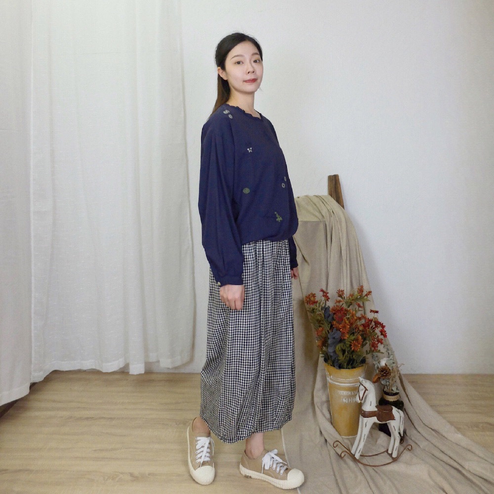花木馬日系女裝綁帶鬆緊腰格紋打褶寬褲