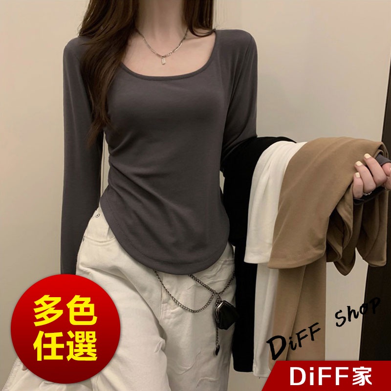 【DIFF】韓版彈性修身顯瘦不規則長袖上衣 女裝 衣服 寬鬆上衣 顯瘦上衣 冬裝 長袖t恤 素T 素色【W202】