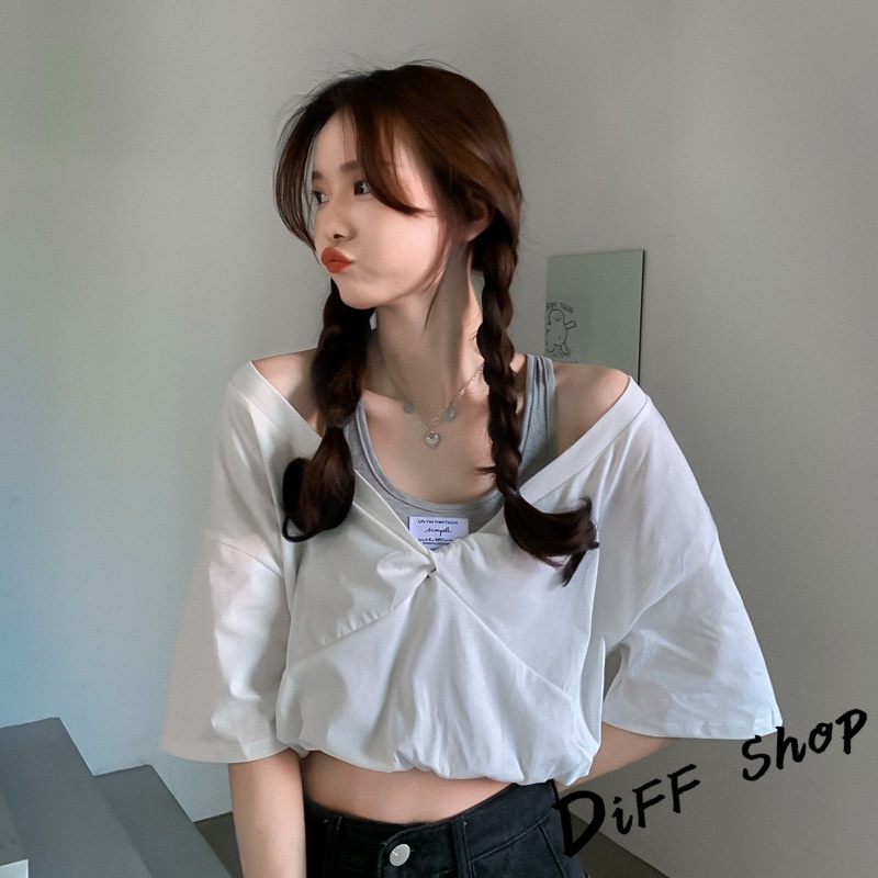 【DiFF】韓版設計感假兩件小眾寬鬆短款上衣 短袖上衣 短袖t恤 女裝 衣服 寬鬆上衣 素T 短板上衣【T388】