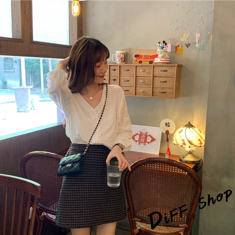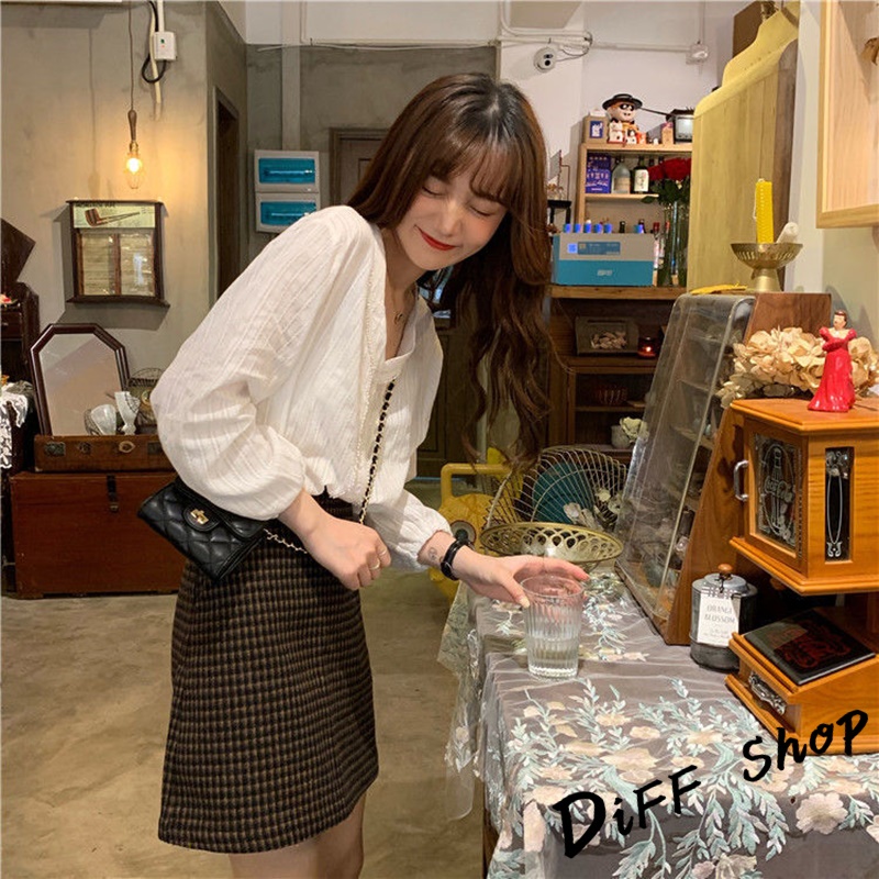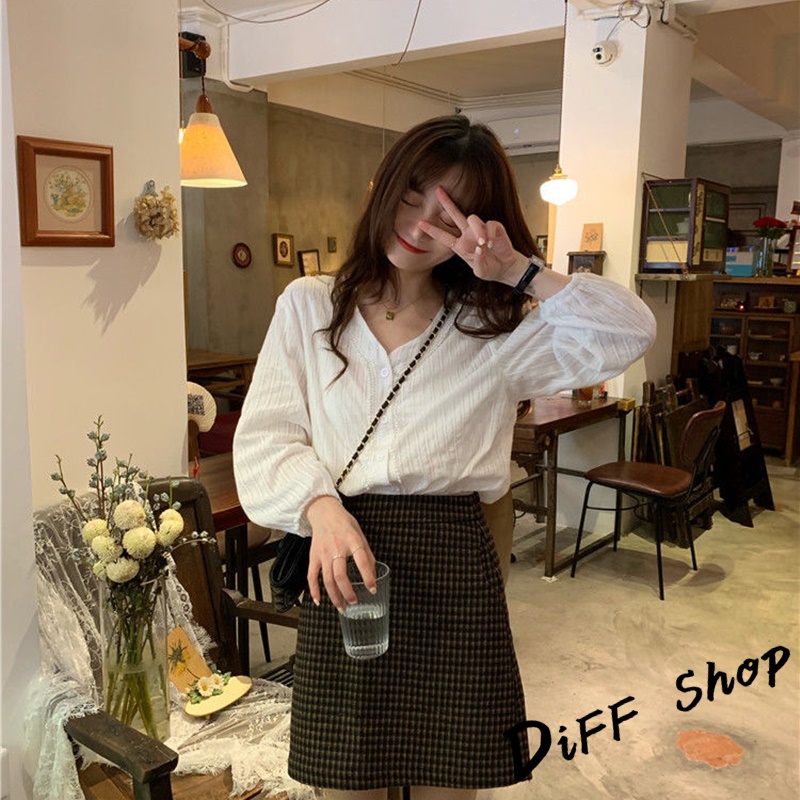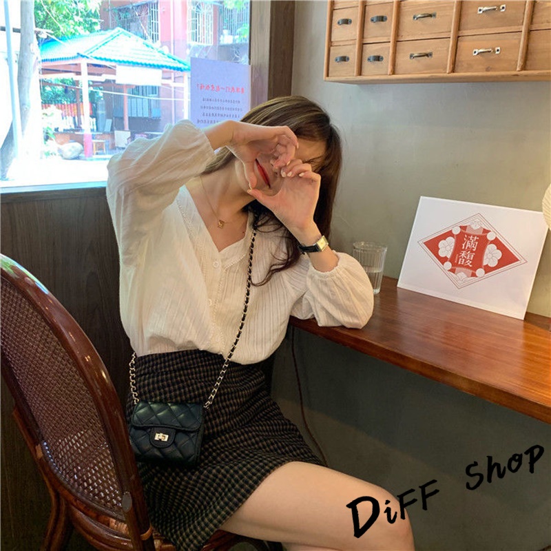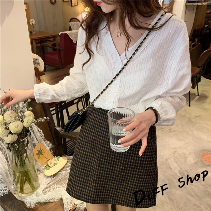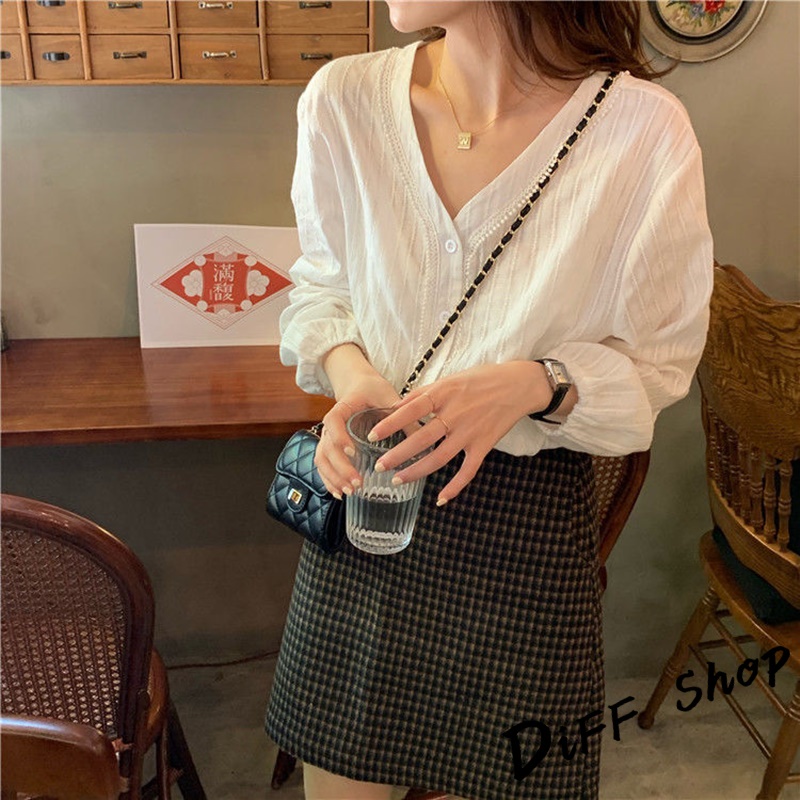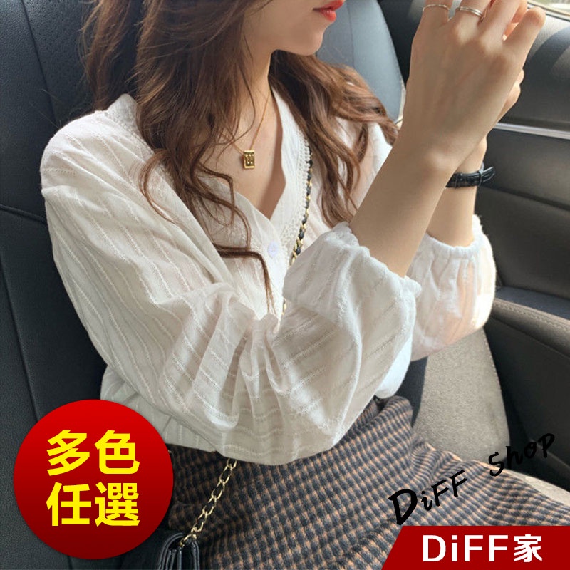 【DIFF】韓版元氣甜美排扣V領蕾絲長袖襯衫 長袖上衣 女裝 衣服 寬鬆上衣 顯瘦上衣 冬裝 長袖t恤 素T【W210】