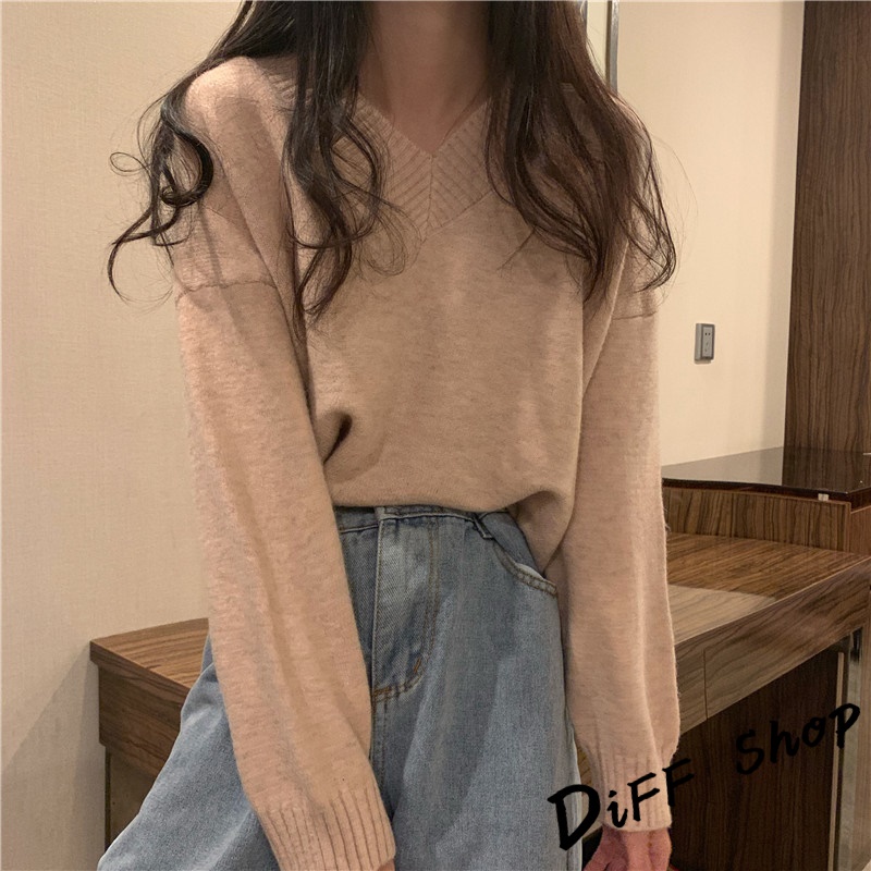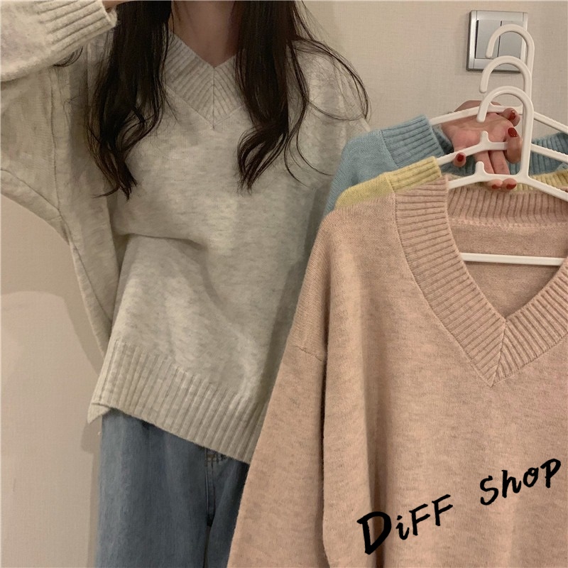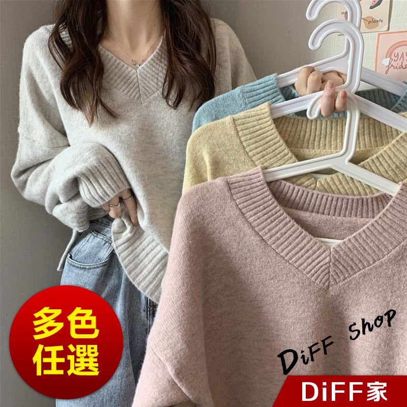 【DIFF】韓版v領寬鬆針織上衣 毛衣 長袖上衣 女裝 衣服 寬鬆上衣 顯瘦上衣 冬裝 長袖t恤 素T 素色【W222】
