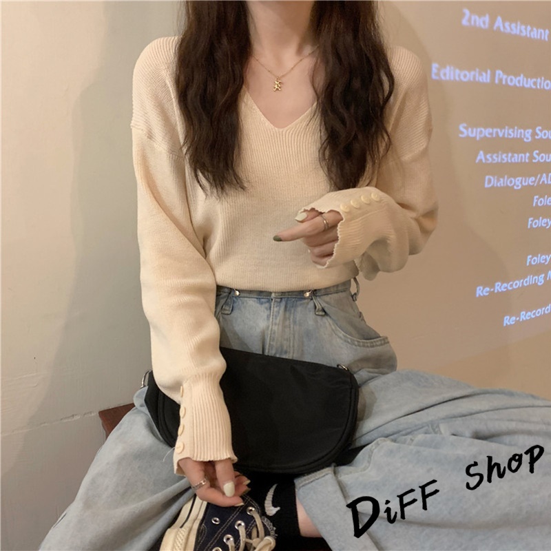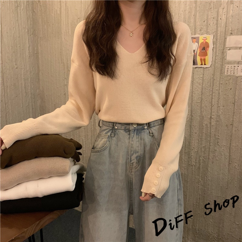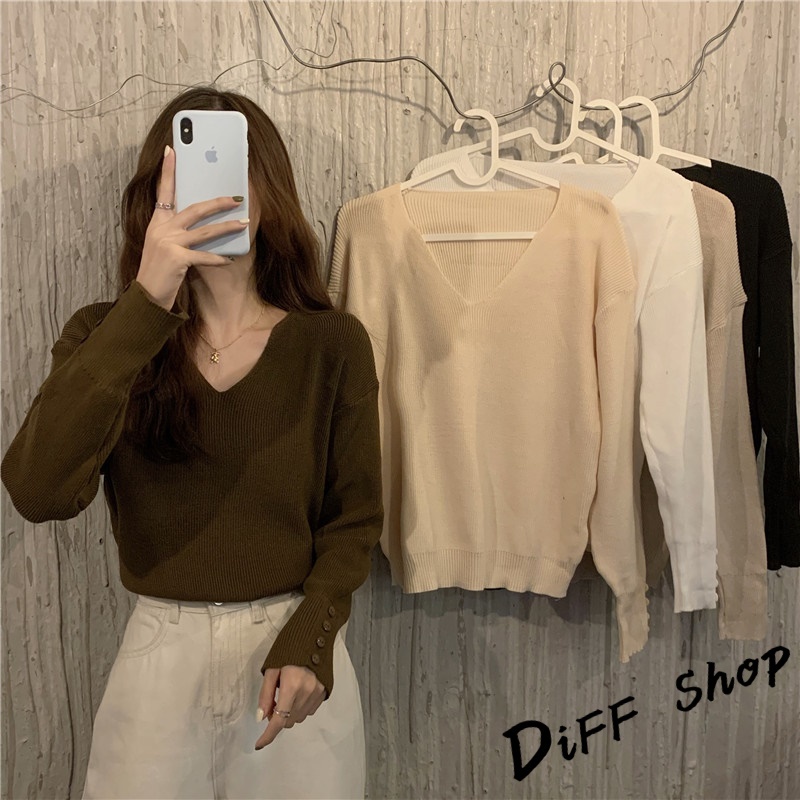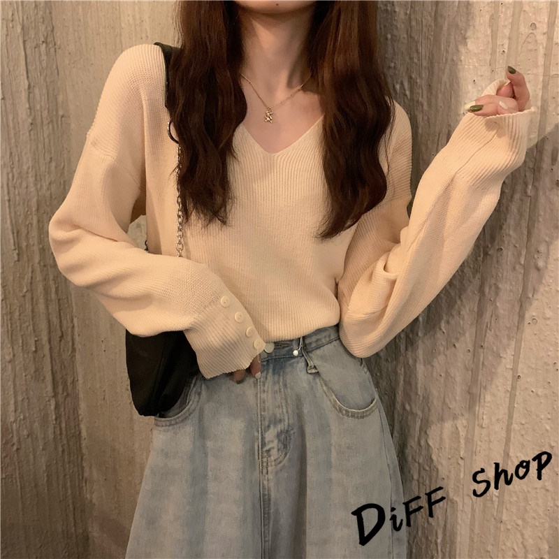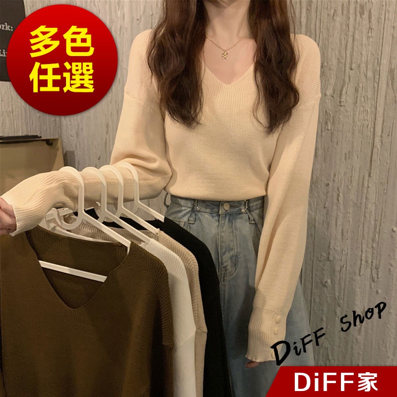 【DIFF】韓版溫柔風v領針織上衣 毛衣 長袖上衣 女裝 衣服 寬鬆上衣 顯瘦上衣 冬裝 長袖t恤 素T【S99】