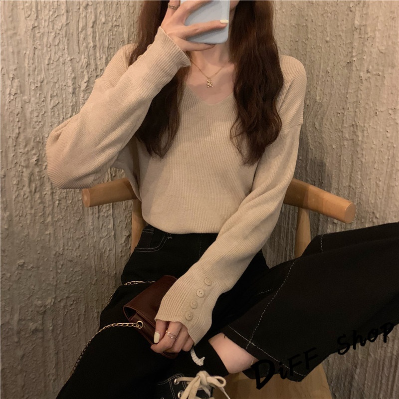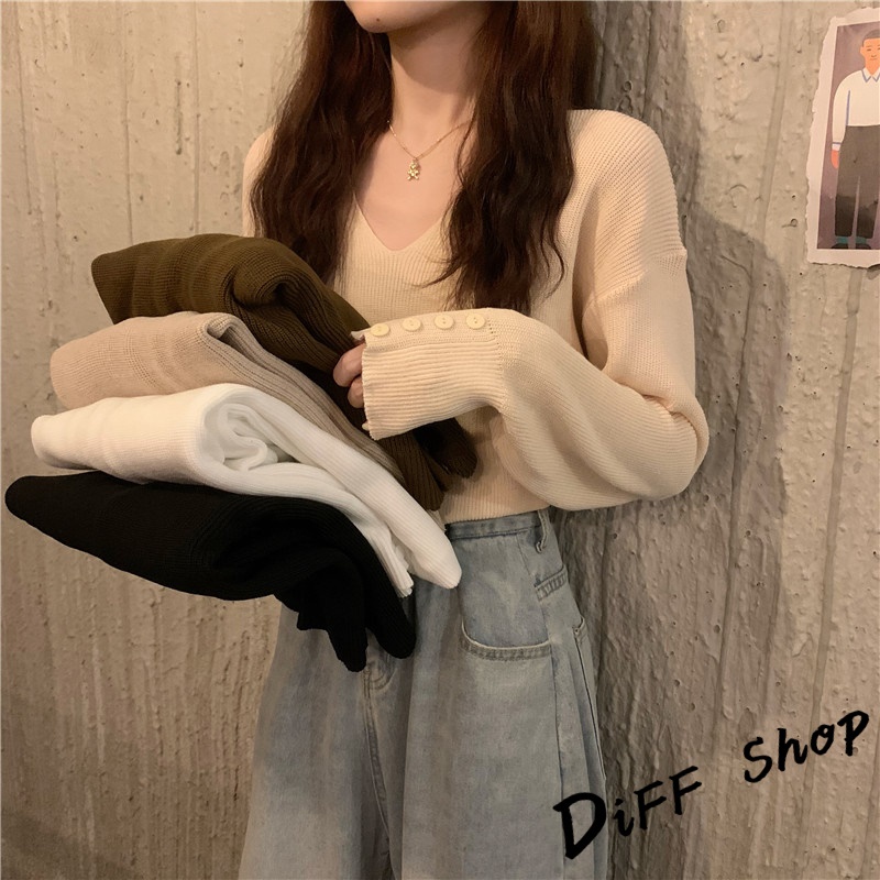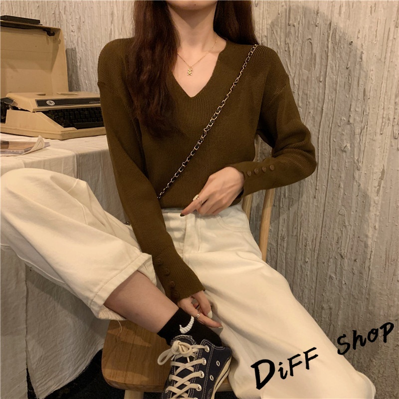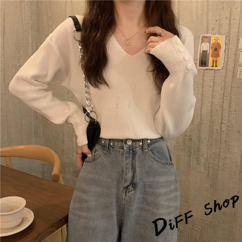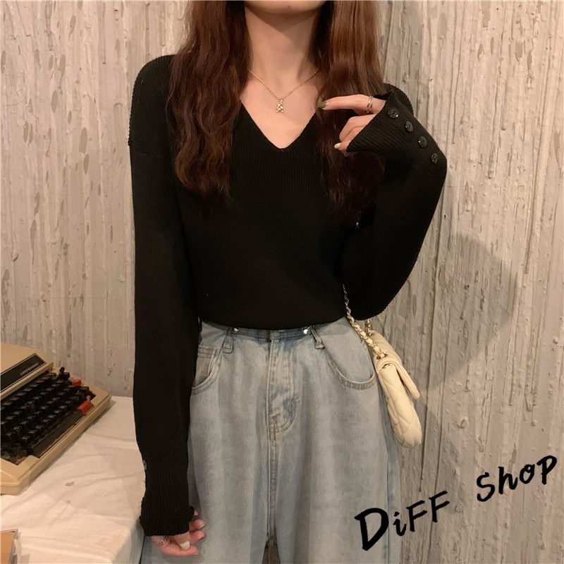 【DIFF】韓版溫柔風v領針織上衣 毛衣 長袖上衣 女裝 衣服 寬鬆上衣 顯瘦上衣 冬裝 長袖t恤 素T【S99】