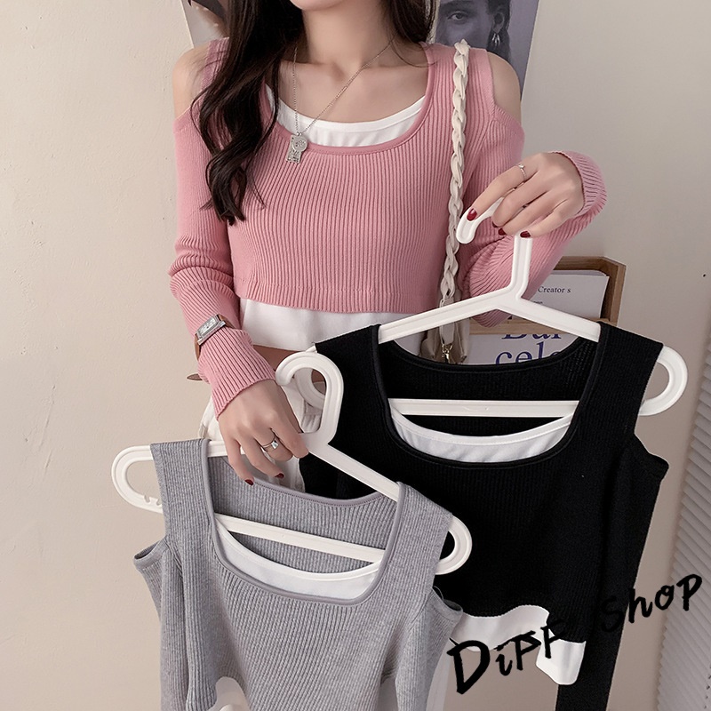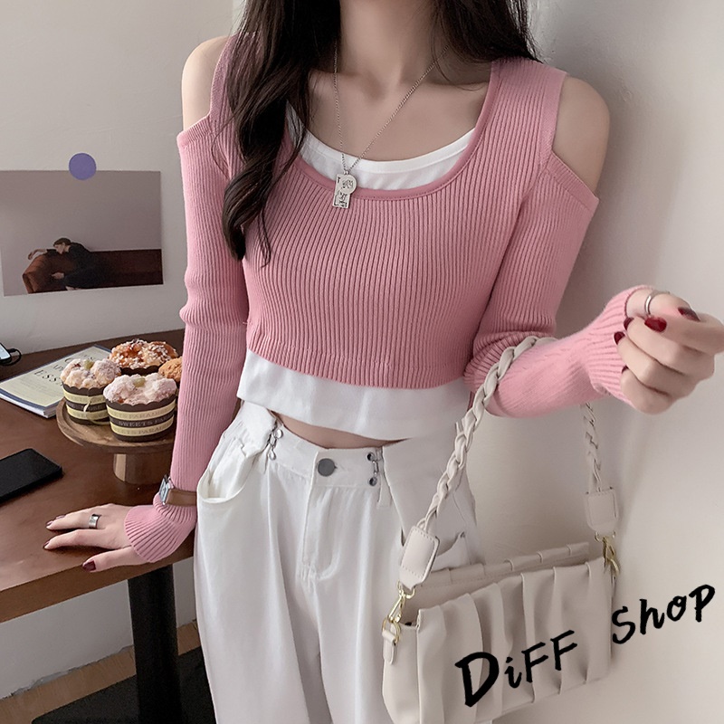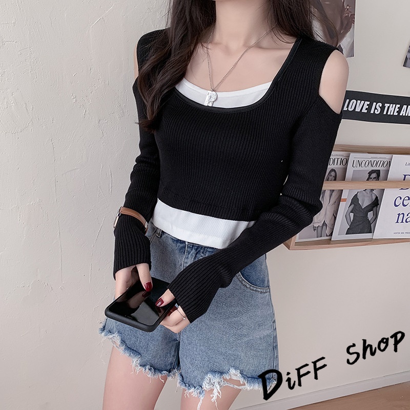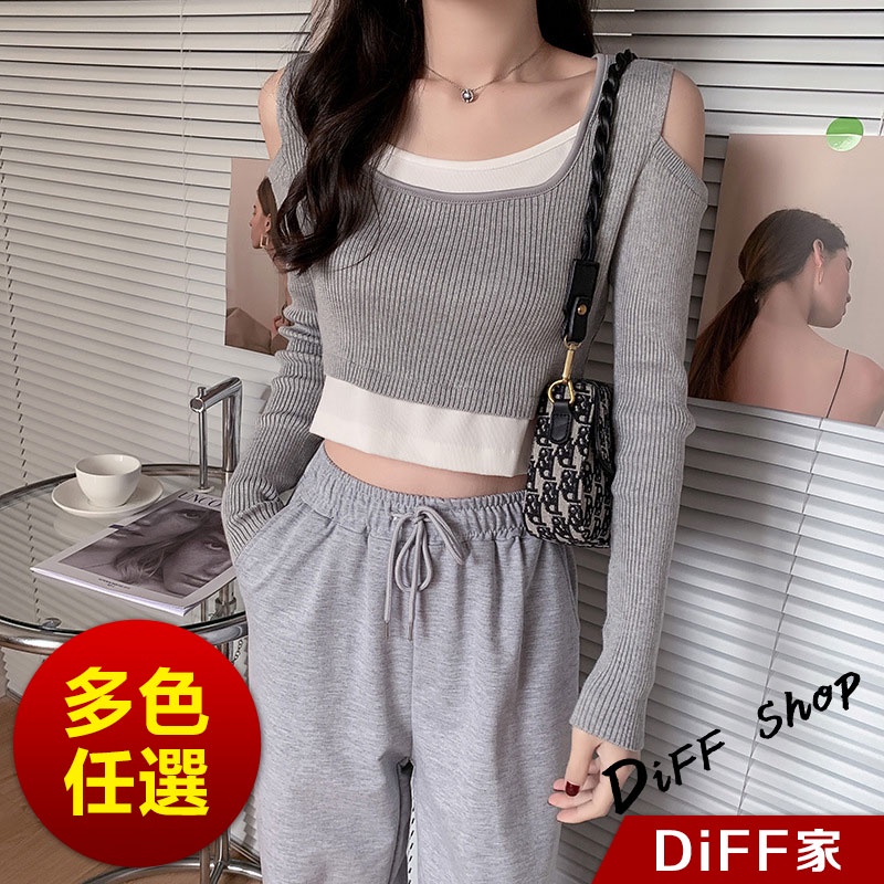 【DIFF】韓版設計感假兩件露肩針織上衣 長袖上衣 女裝 衣服 寬鬆上衣 顯瘦上衣 長袖t恤 冬裝 素T【W303】