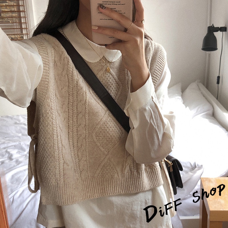 【DIFF】韓版設計感側邊綁帶麻花背心 毛衣 女裝 上衣 冬裝 針織上衣【W260】