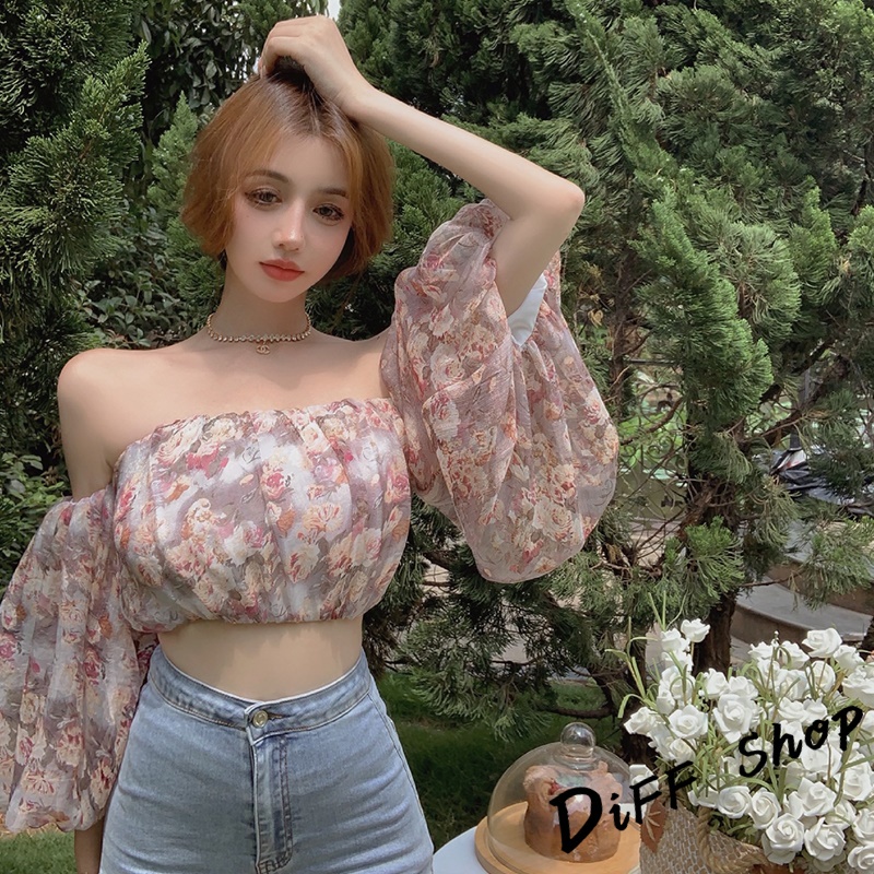 【DIFF】韓版小眾設計清新碎花燈籠袖一字領上衣 平口上衣 露肩上衣 短版上衣 女裝 顯瘦上衣 衣服【T398】