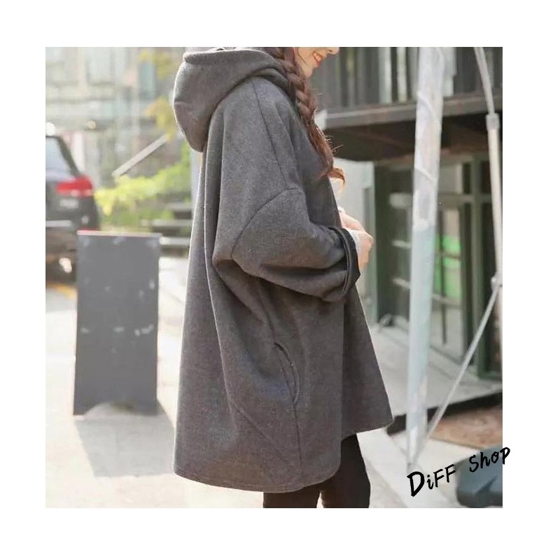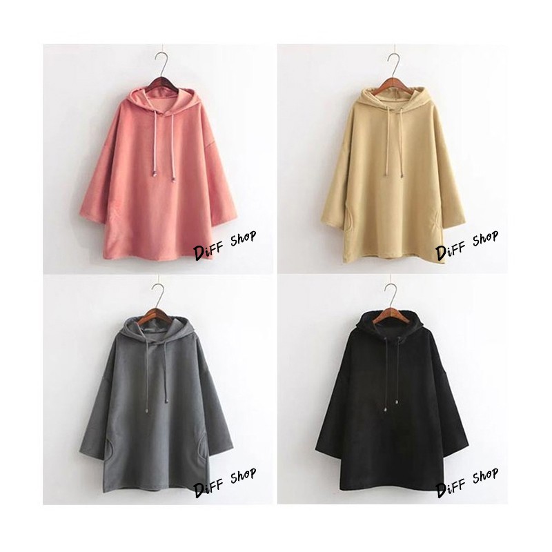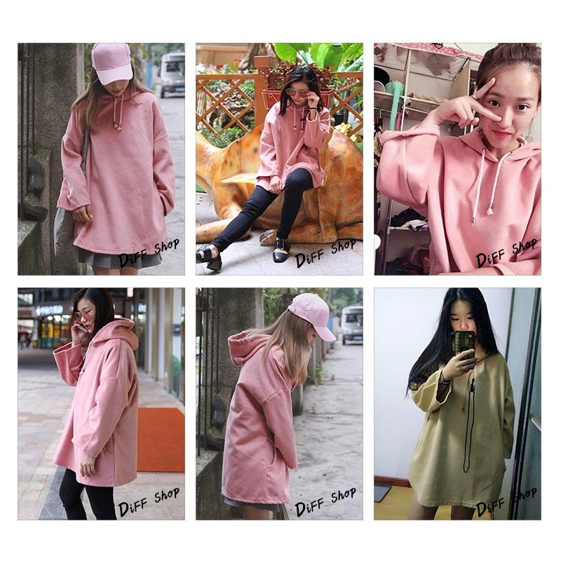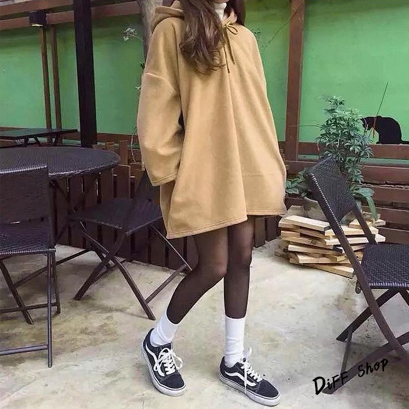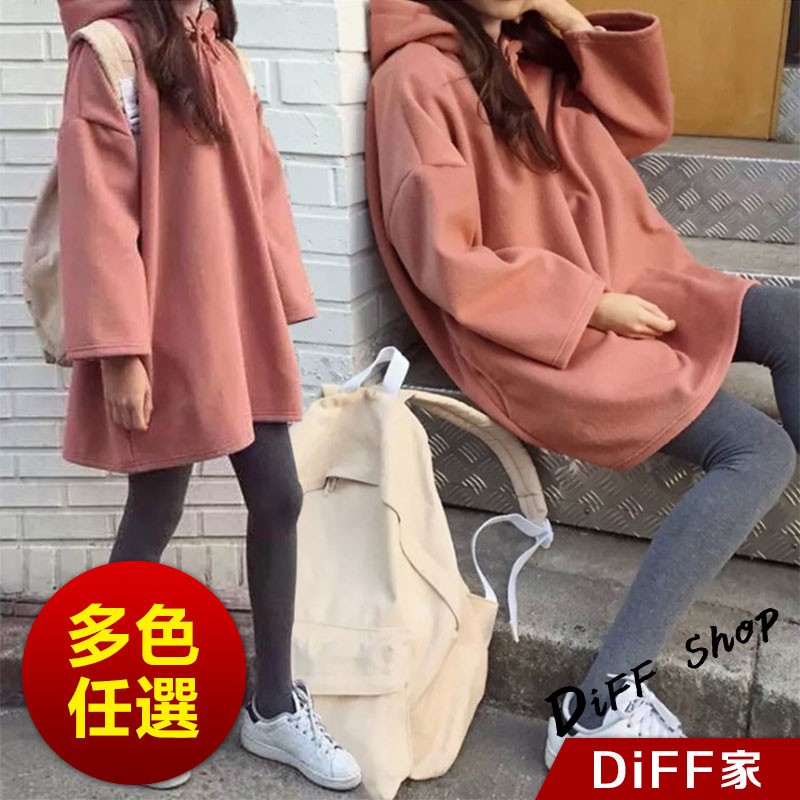【DIFF】韓版中長款寬鬆內刷連帽長袖上衣 長袖t恤 女裝 衣服 大學T 顯瘦上衣 素T 素色 冬天 帽t【W46】