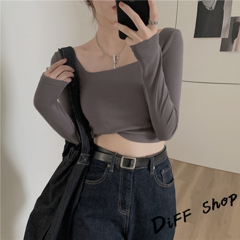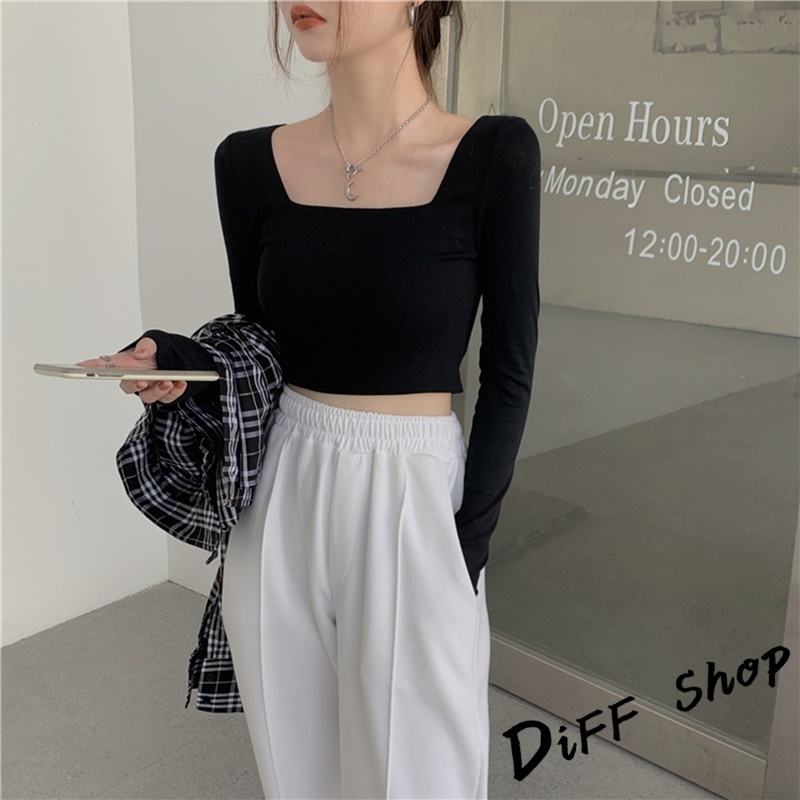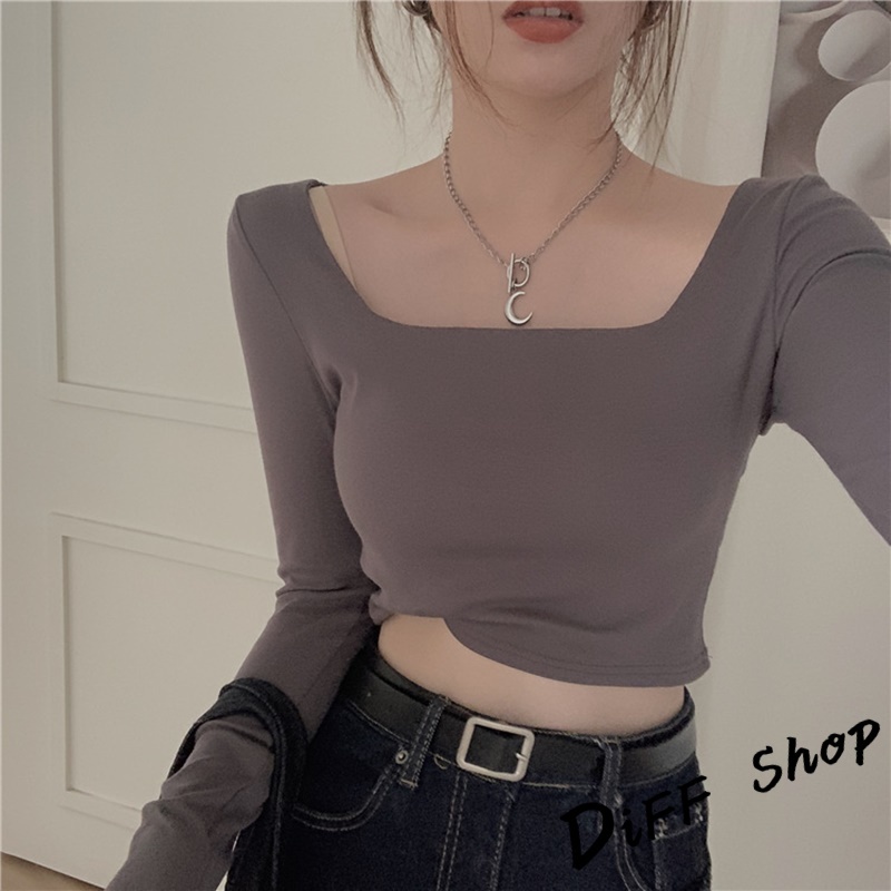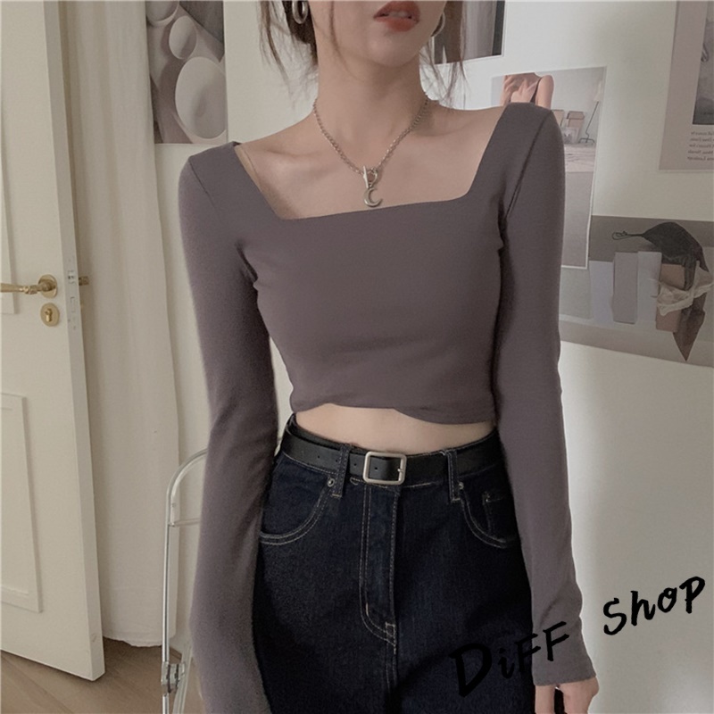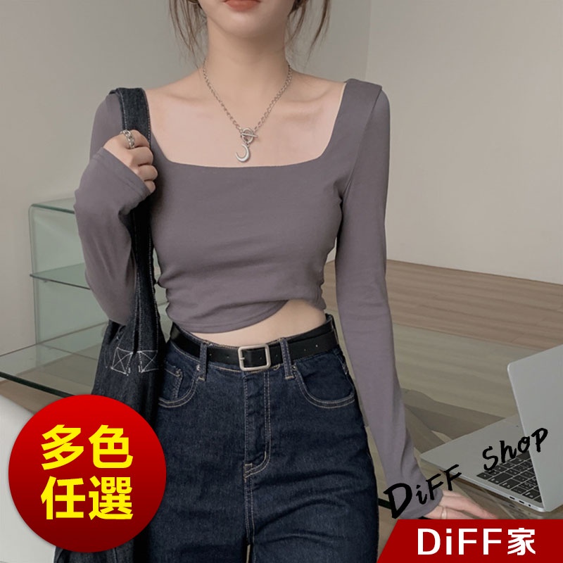 【DIFF】韓版露鎖骨方領短版長袖上衣 女裝 衣服 寬鬆上衣 顯瘦上衣 長袖t恤 冬裝 素T 素色 大學T【W298】