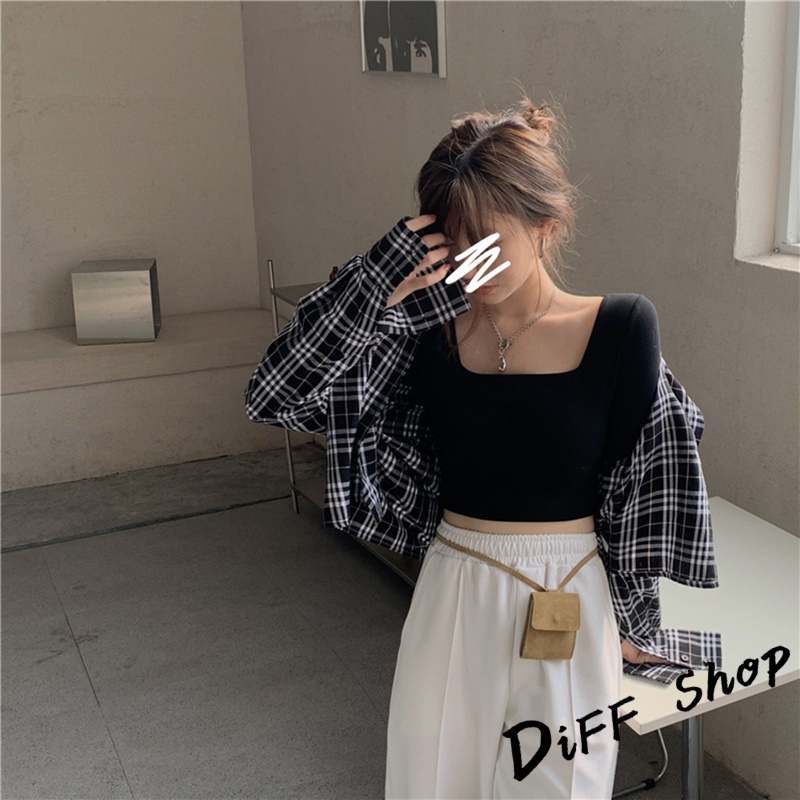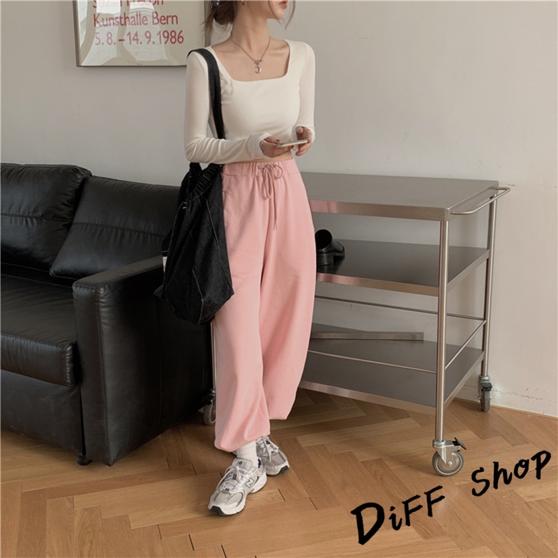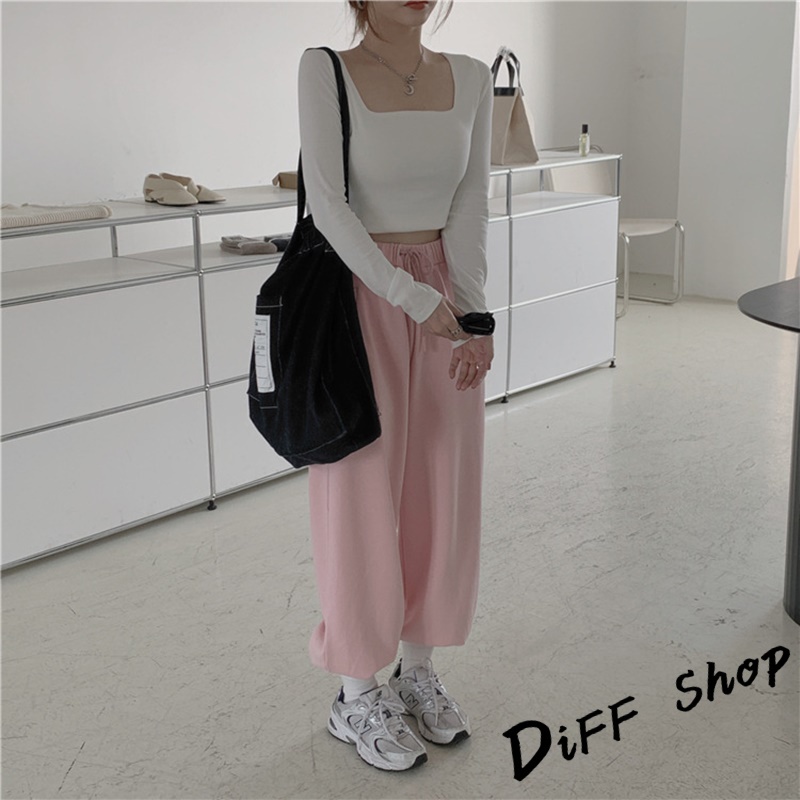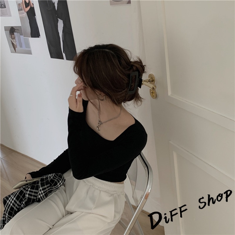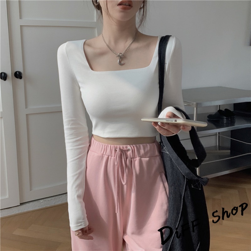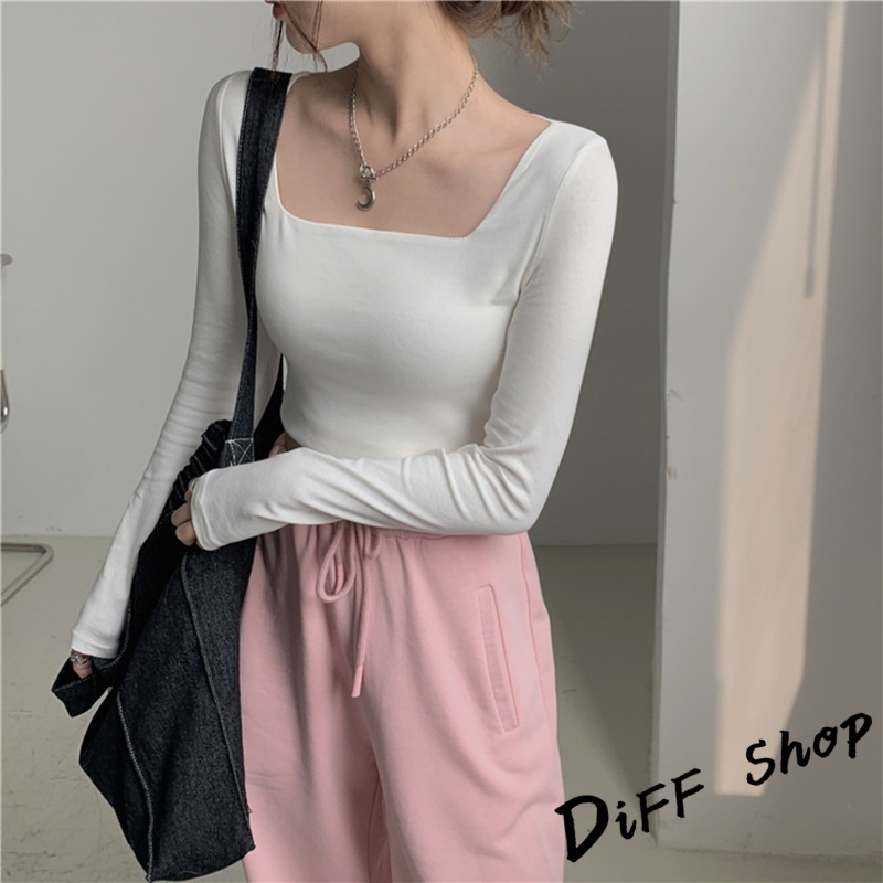 【DIFF】韓版露鎖骨方領短版長袖上衣 女裝 衣服 寬鬆上衣 顯瘦上衣 長袖t恤 冬裝 素T 素色 大學T【W298】