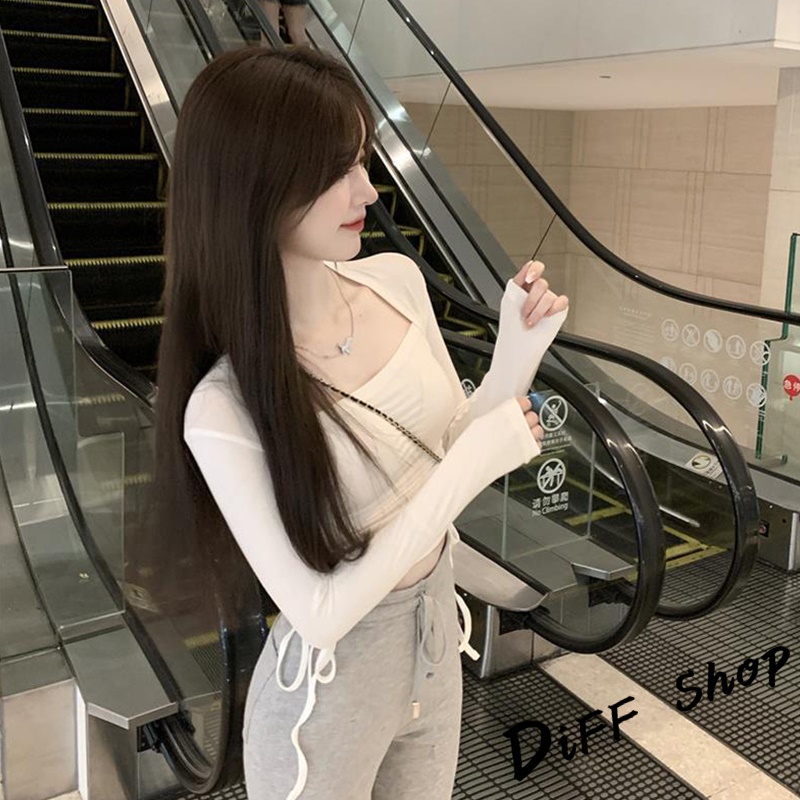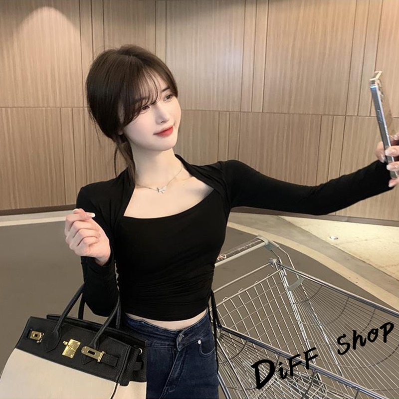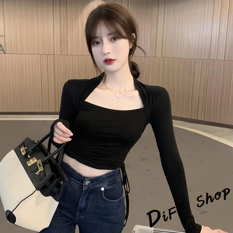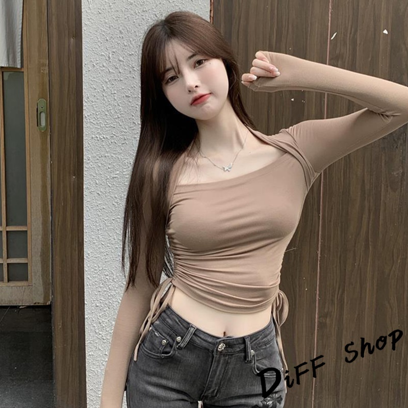 【DIFF】韓版設計感彈性顯瘦抽繩長袖上衣 女裝 衣服 寬鬆上衣 顯瘦上衣 長袖t恤 冬裝 素T 素色【W313】