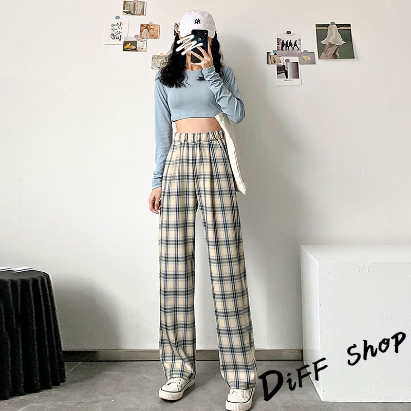 【DIFF】韓版休閒寬鬆直筒顯瘦墜感格子褲 寬褲 拖地褲 落地褲 褲子 長褲 休閒褲 女裝【P190】