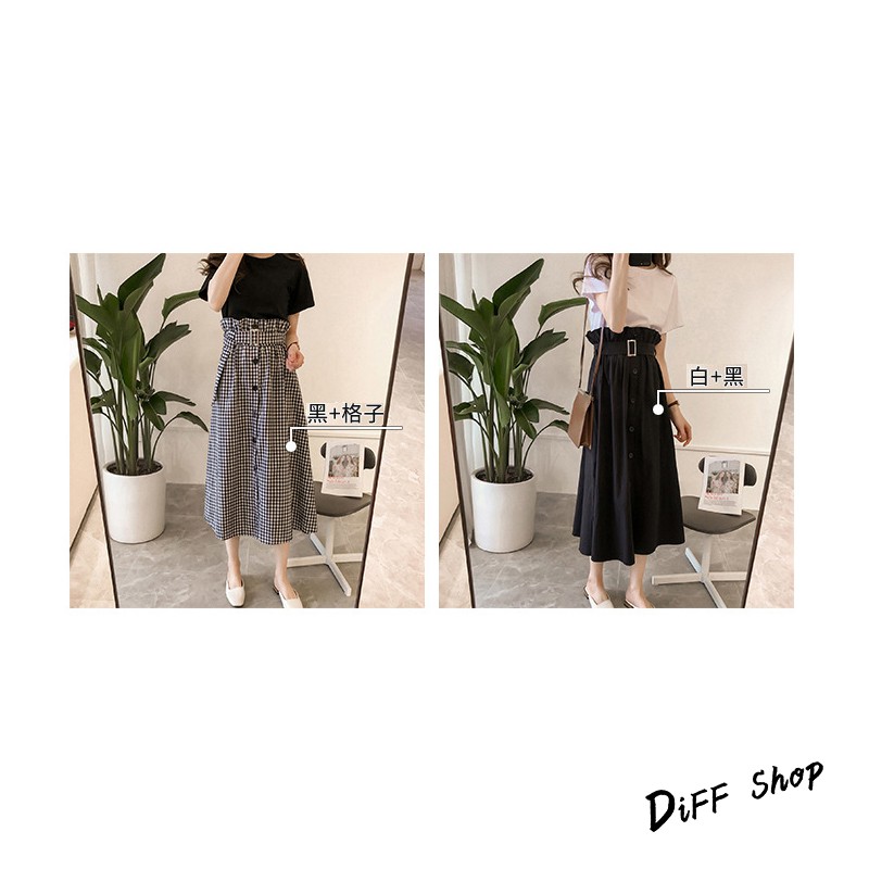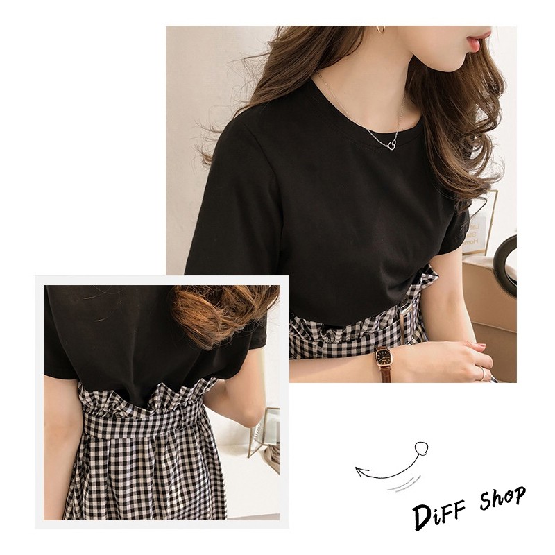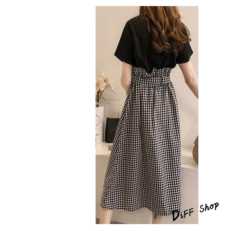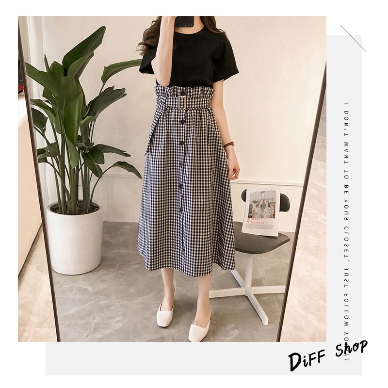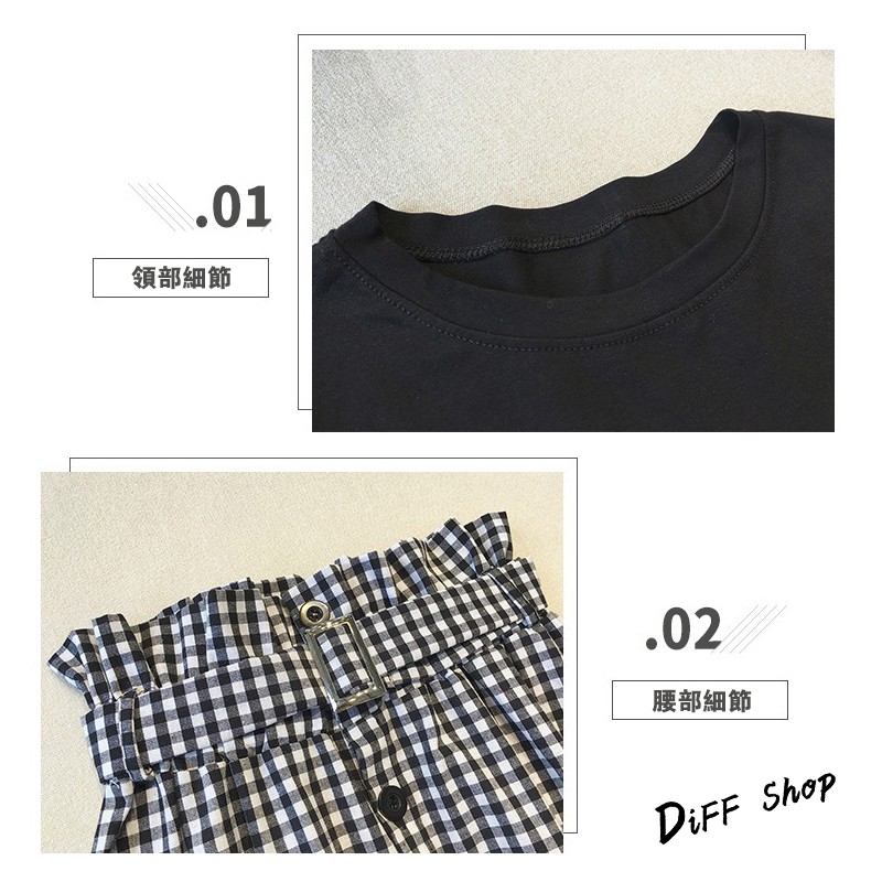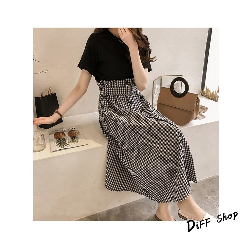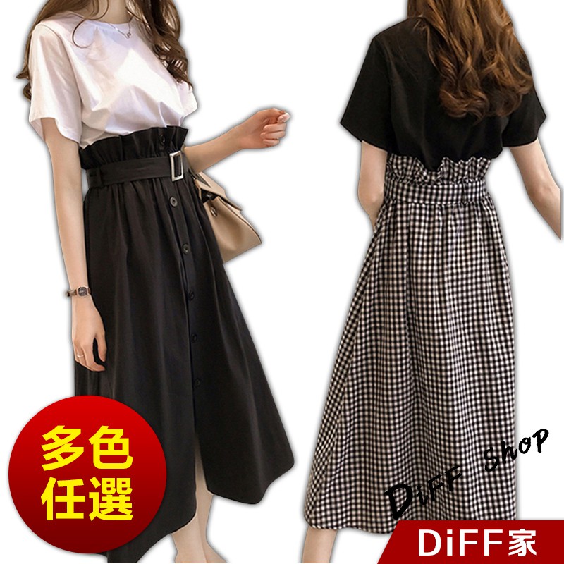 【DIFF】韓版素色上衣+格子長裙 套裝【S48】