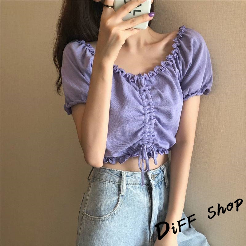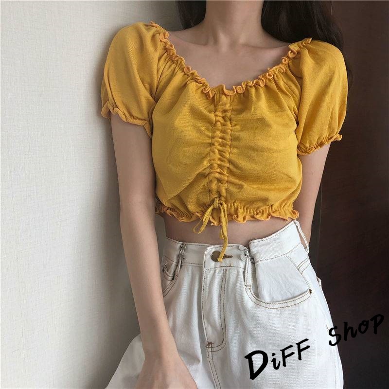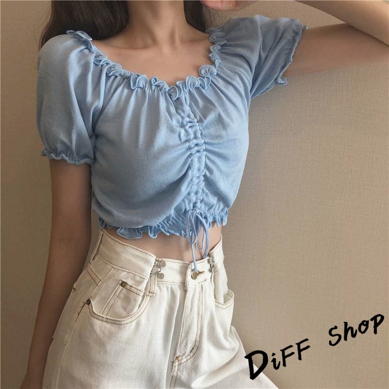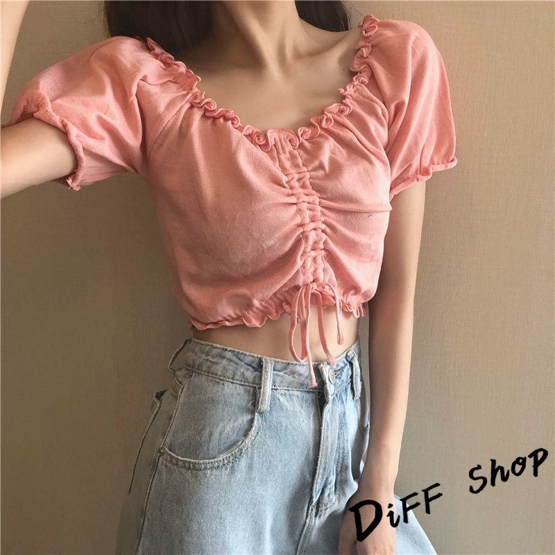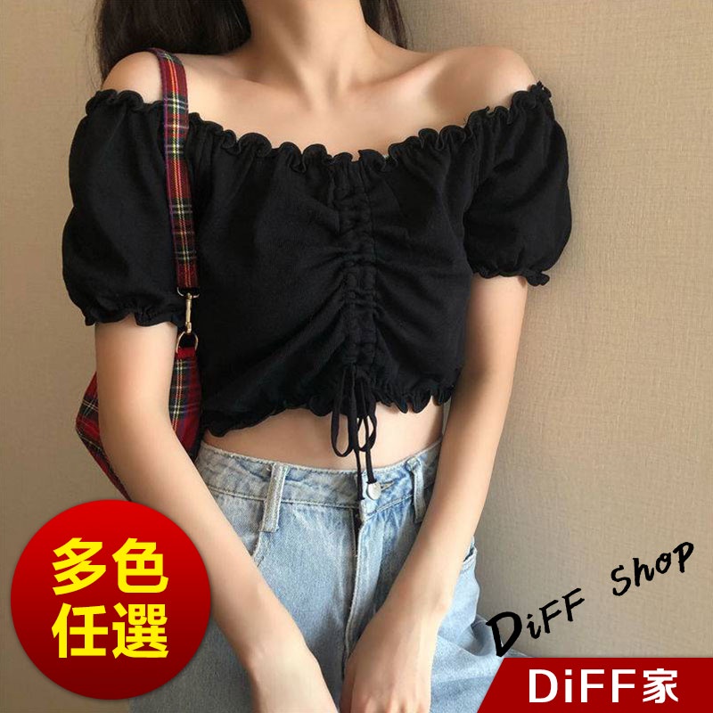【DIFF】韓版花邊一字領小眾抽繩短版上衣 短袖上衣 短袖t恤 女裝 顯瘦上衣 衣服 寬鬆上衣 短板上衣【T489】