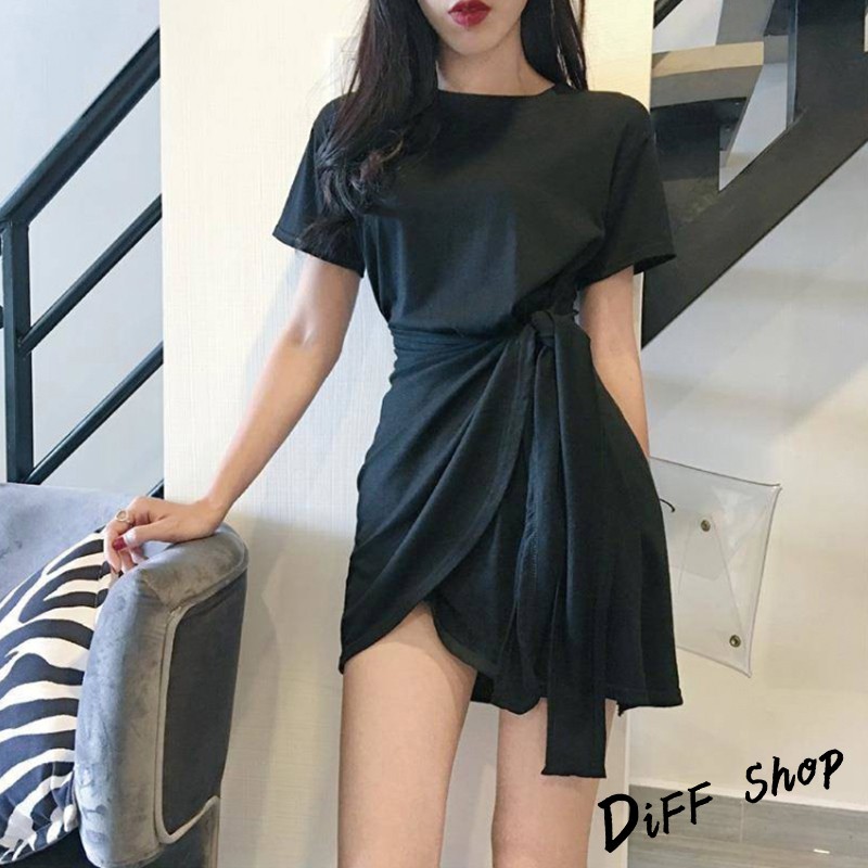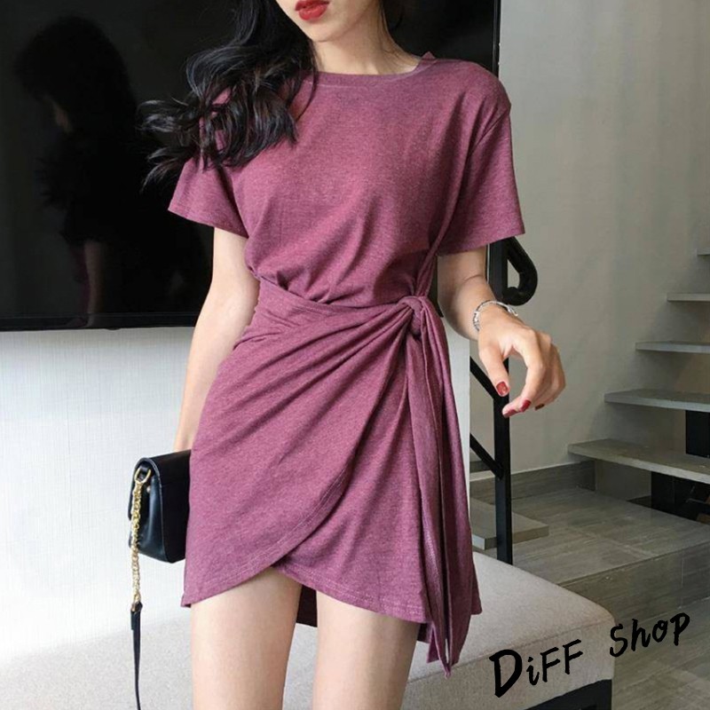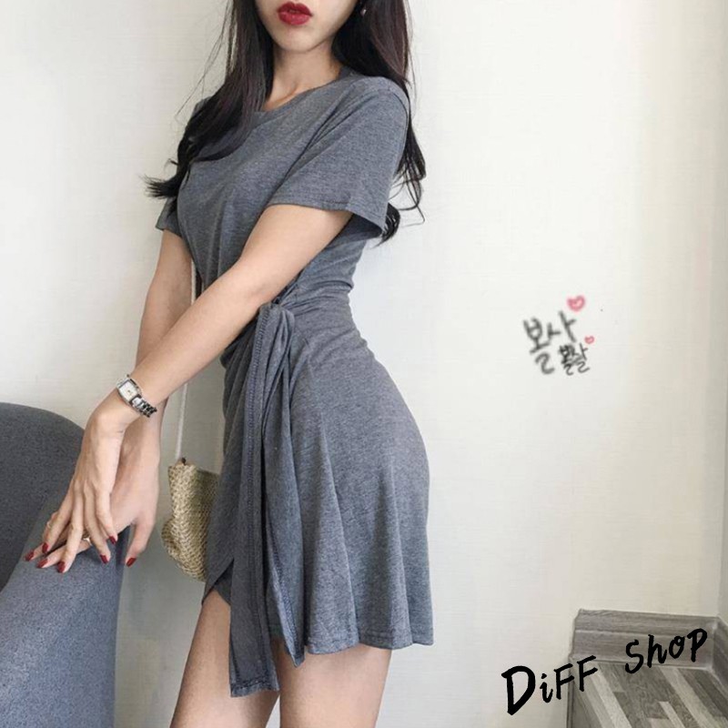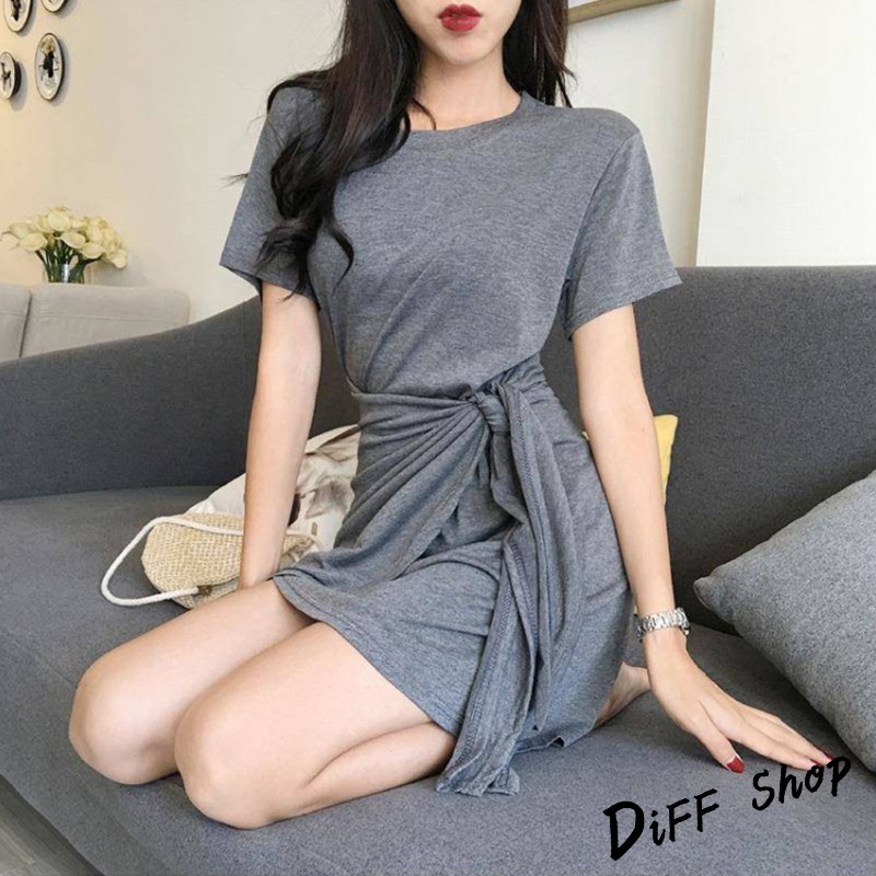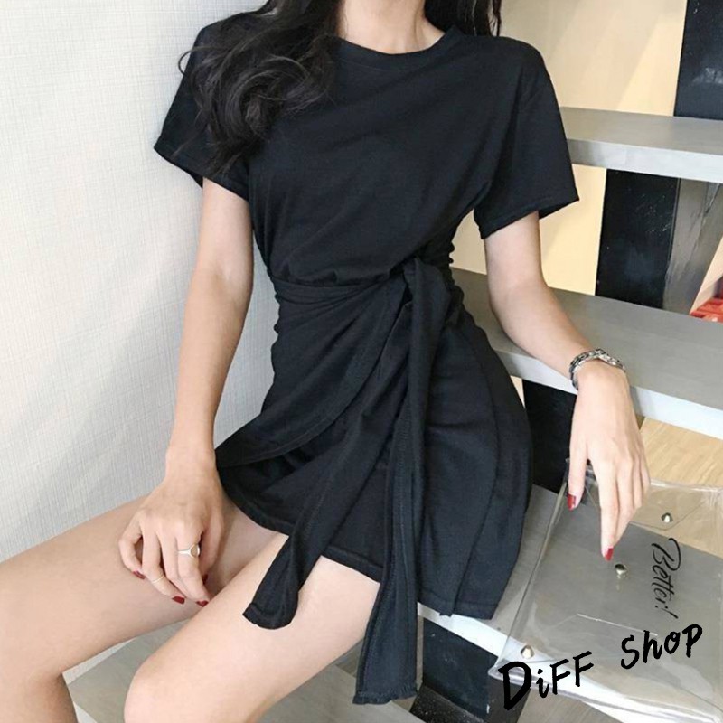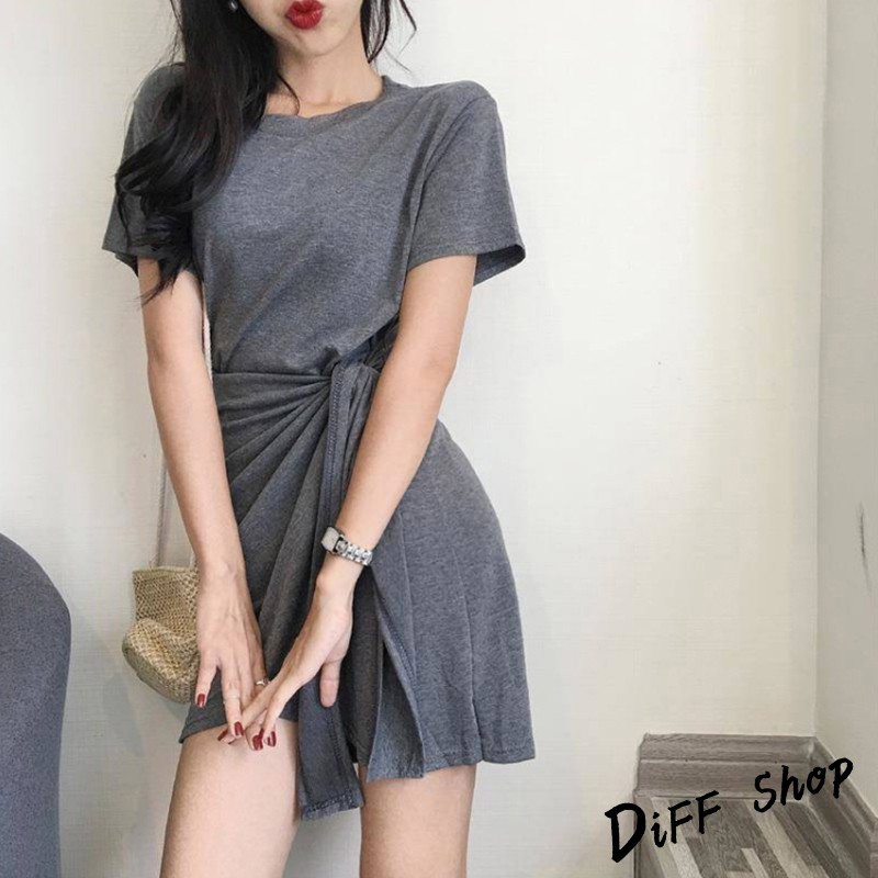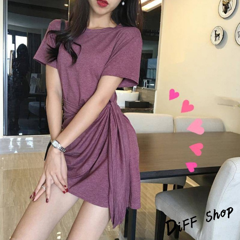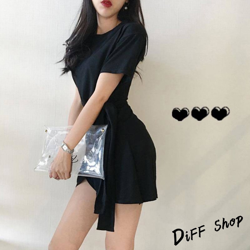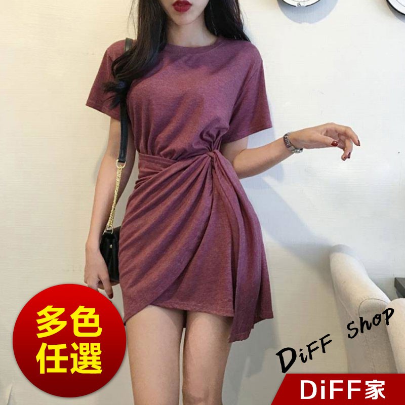 【DIFF】網紅指定款 韓版綁帶顯瘦收腰連衣裙 長版上衣 素T 素色 短袖上衣 T桖 女裝 衣服 裙子 洋裝【T210】