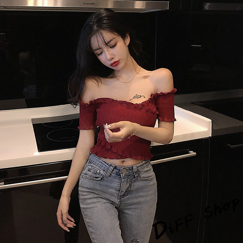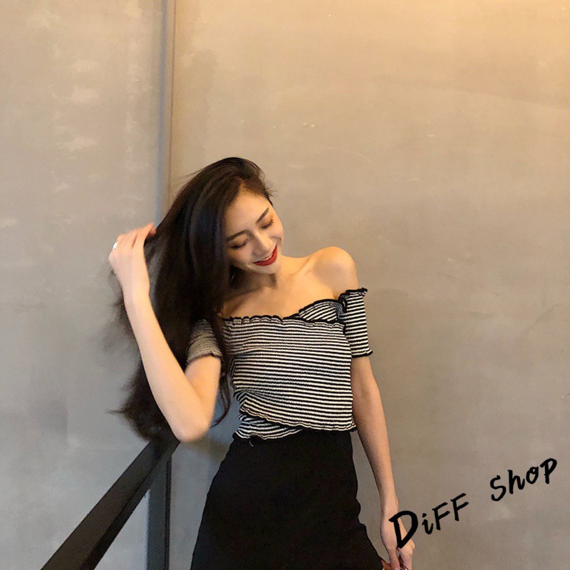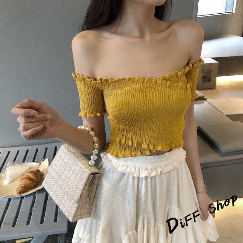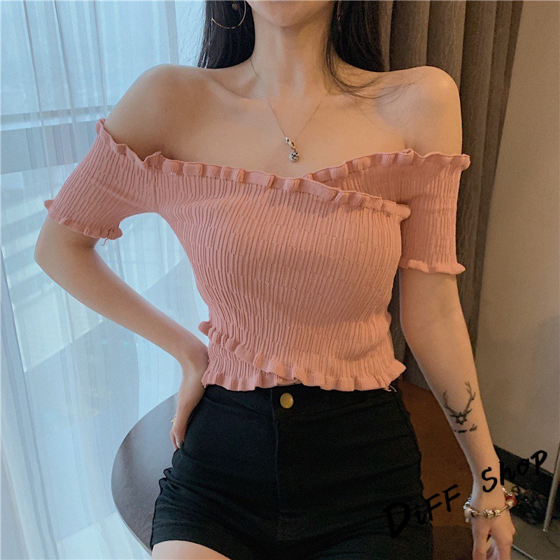 【DIFF】韓版甜美性感一字領百搭短版針織上衣 短袖上衣 短袖t恤 女裝 顯瘦上衣 衣服 寬鬆上衣 素T【T228】