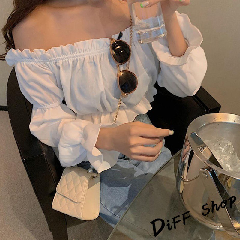 【DIFF】韓版泡泡袖高腰顯瘦一字領露肩長袖上衣 長袖t恤 女裝 衣服 雪紡上衣【W166】