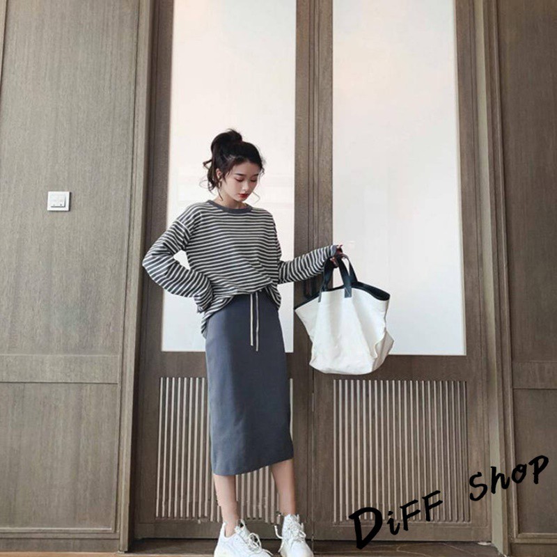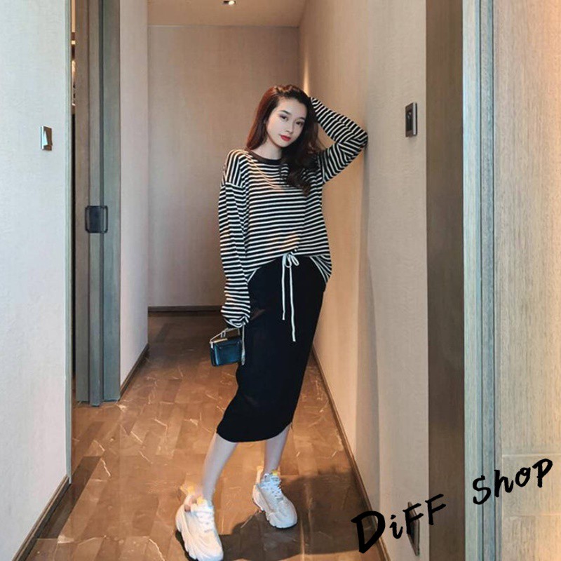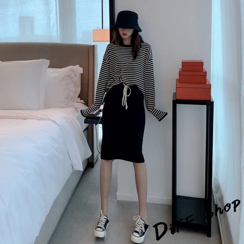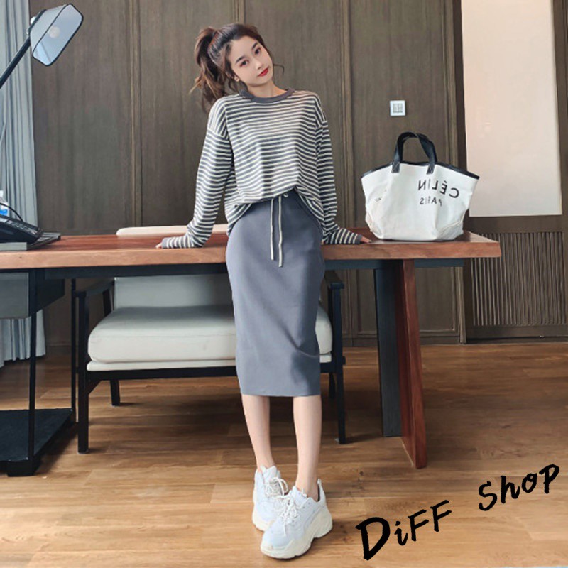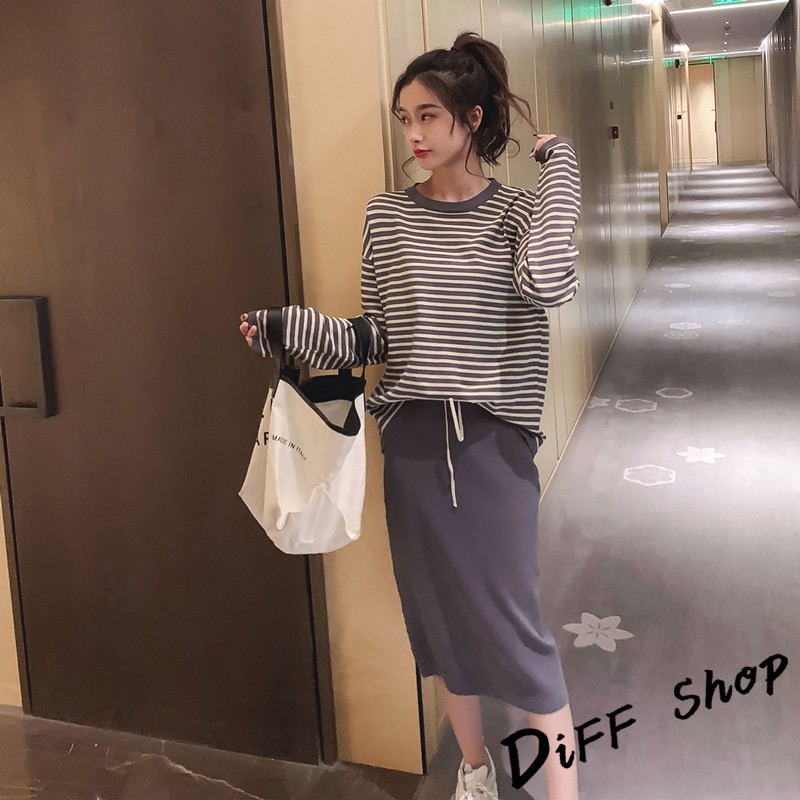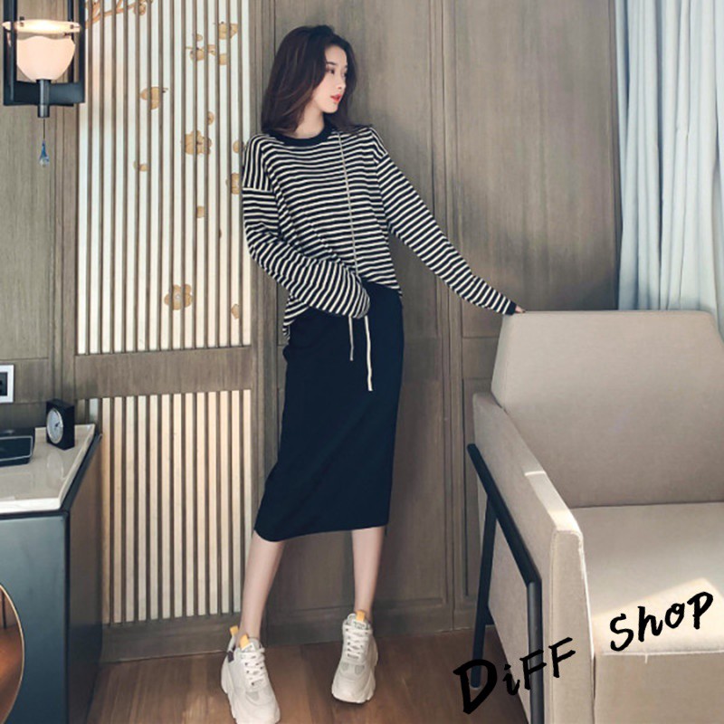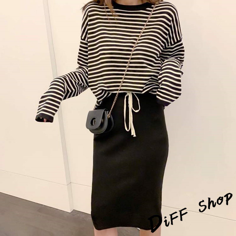 【DIFF】韓版氣質條紋上衣+半身裙套裝 休閒套裝 休閒褲 寬褲 長裙 褲子 長袖上衣 長袖t恤 女裝【S71】