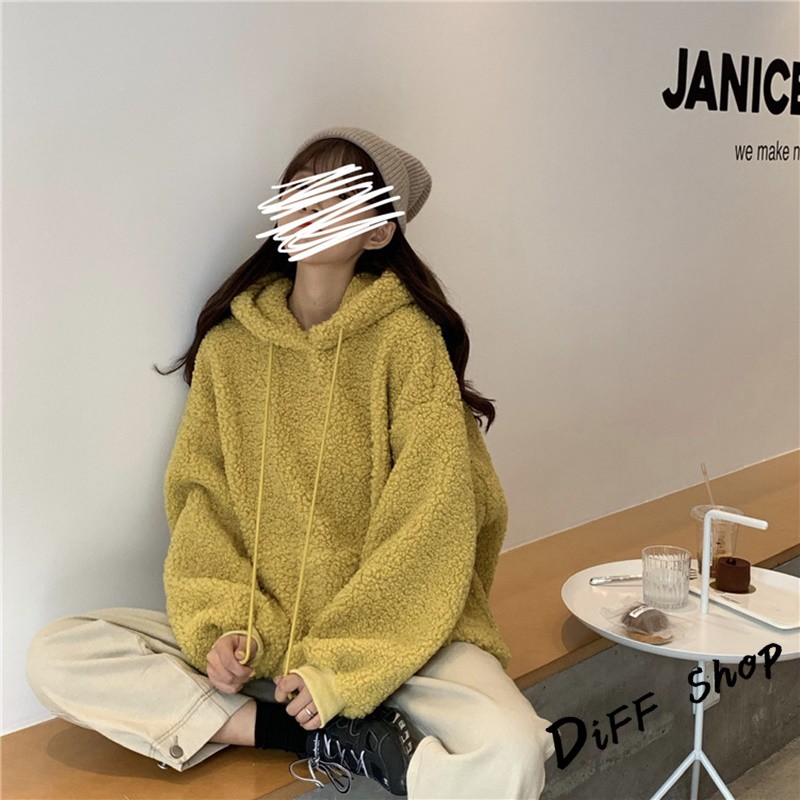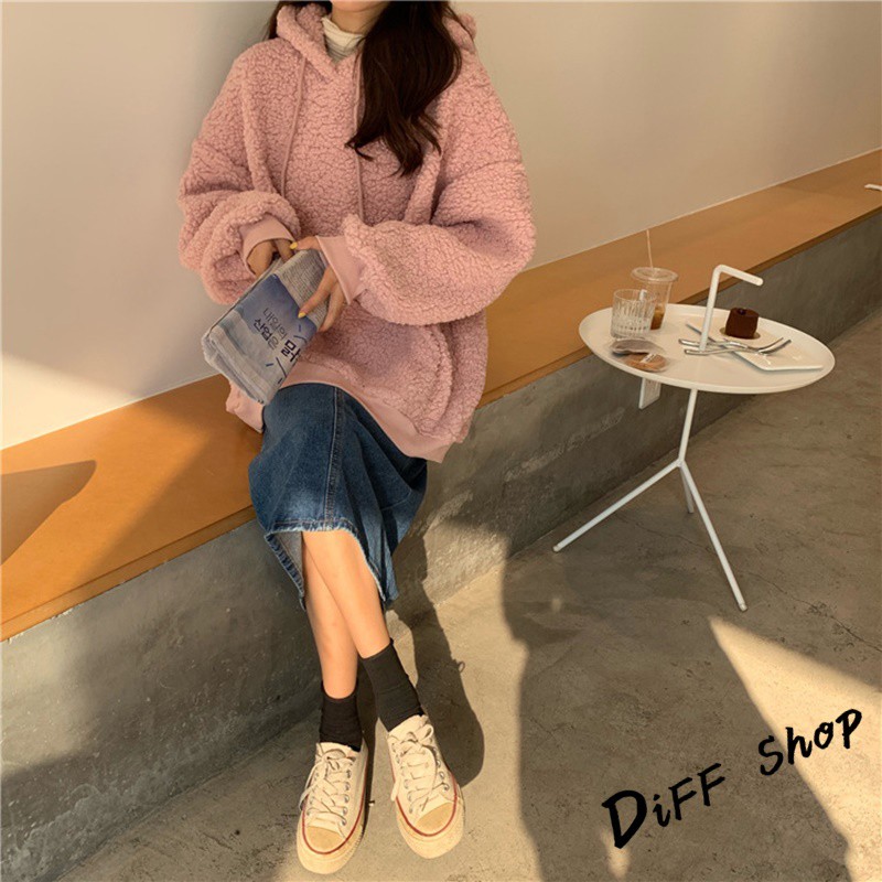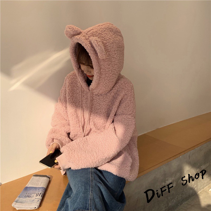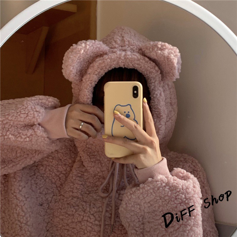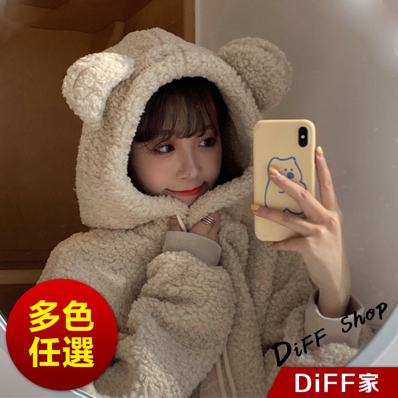 【DIFF】韓版寬鬆可愛保暖毛毛絨小熊大學t 長袖上衣 長袖t恤 衣服 寬鬆上衣 素T 素色 冬天 帽t【W160】