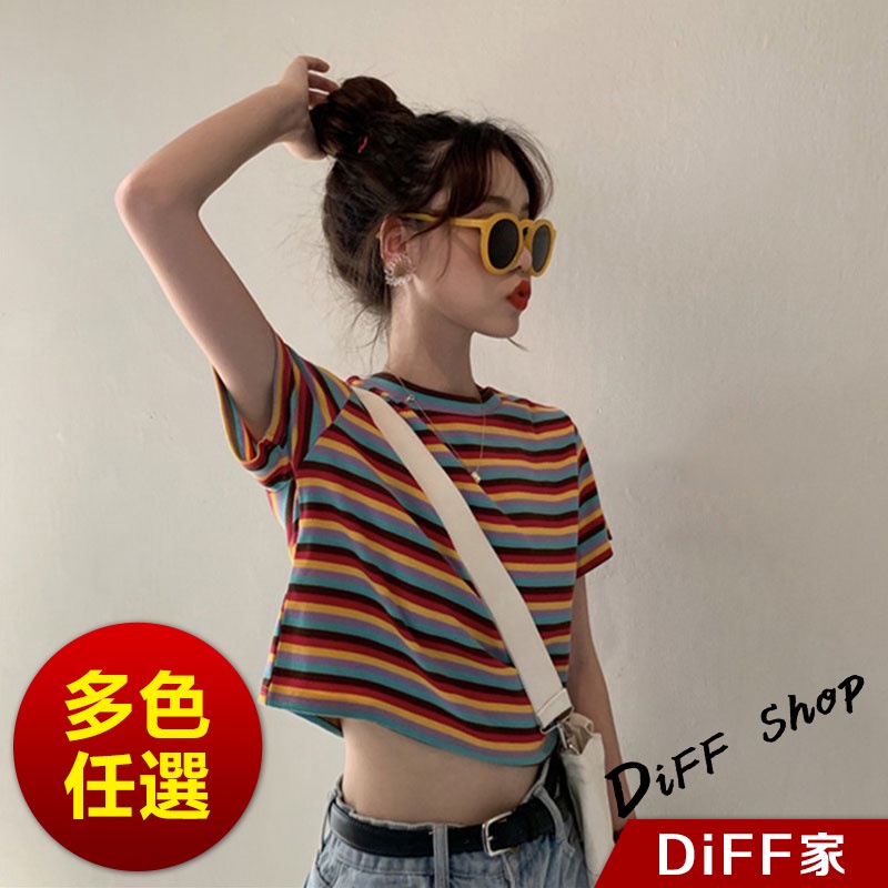 【DIFF】韓版彩虹條紋高腰穿搭短版上衣 短袖上衣 短袖t恤 女裝 顯瘦上衣 衣服 寬鬆上衣 短板上衣【T365】
