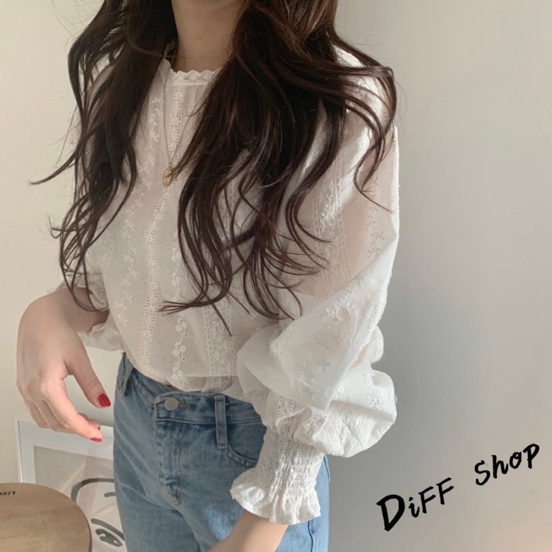 【DIFF】韓版小清新蕾絲勾花長袖上衣 襯衫 雪紡上衣 長袖t恤 女裝 衣服 寬鬆上衣 顯瘦上衣【W147】