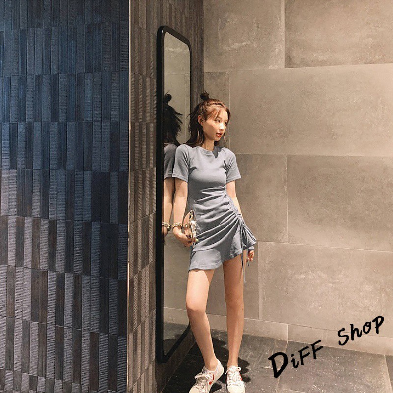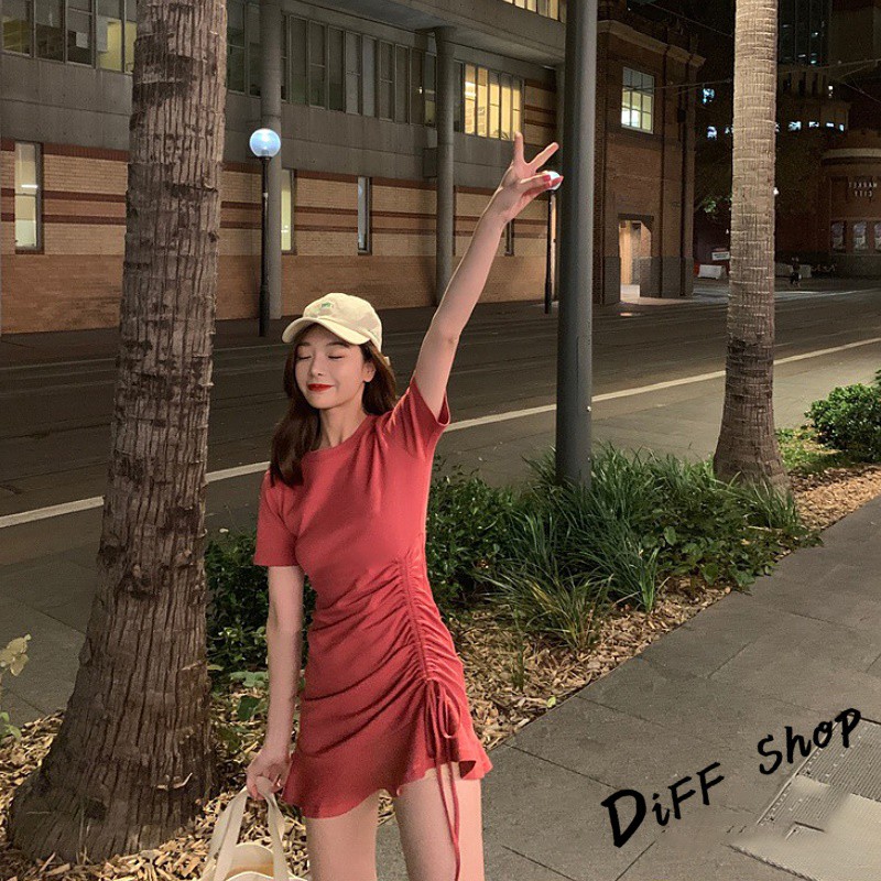 【DIFF】韓版素色中長版修身側邊拉繩短袖上衣 連衣裙 洋裝 套裝 短袖t恤 女裝 顯瘦上衣 衣服 素T【T215】