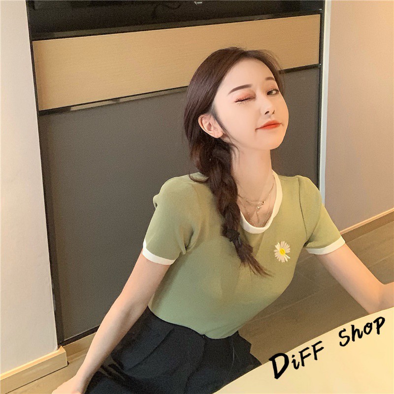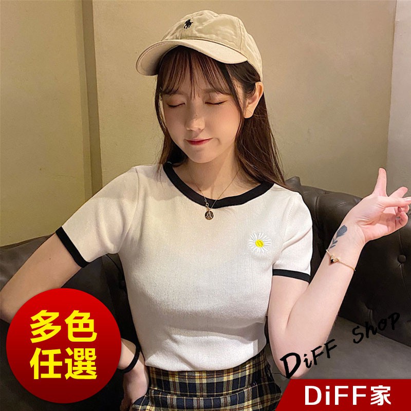 【DIFF】韓版小雛菊刺繡修身顯瘦針織短袖上衣 短袖t恤 女裝 顯瘦上衣 衣服 寬鬆上衣 素T【T271】