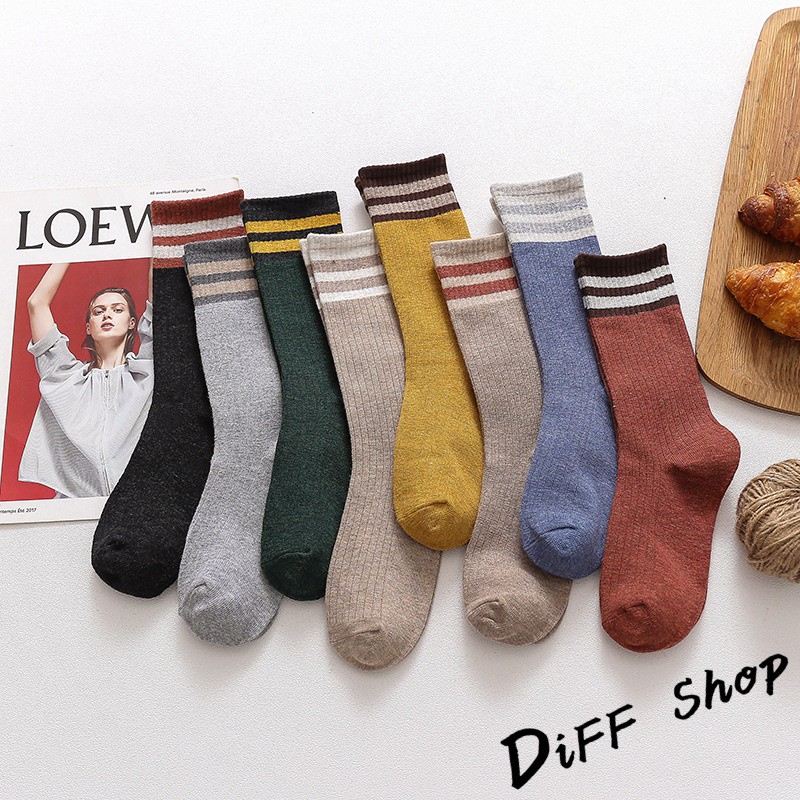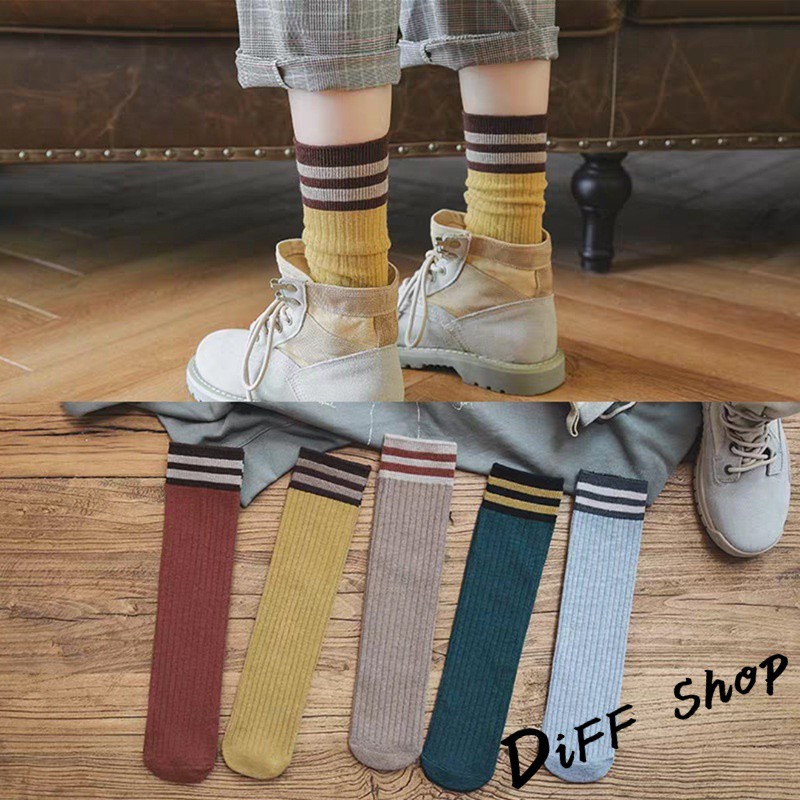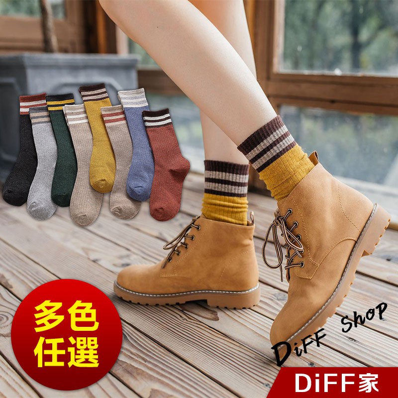 【DIFF】秋冬復古森系素色雙槓中筒襪 襪子 長襪
