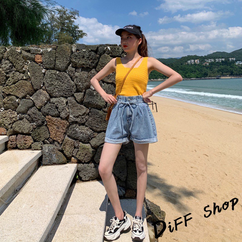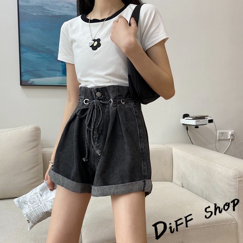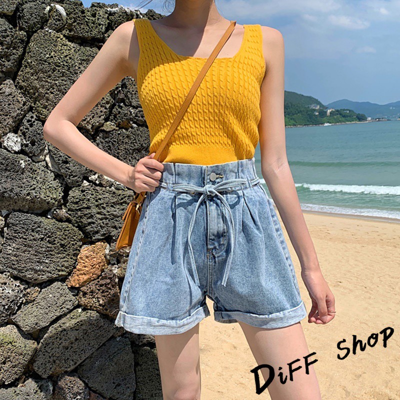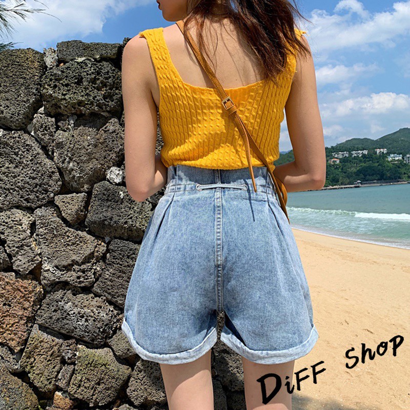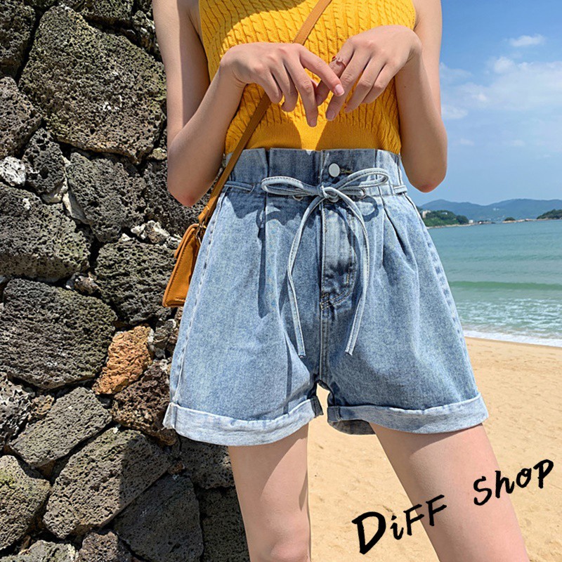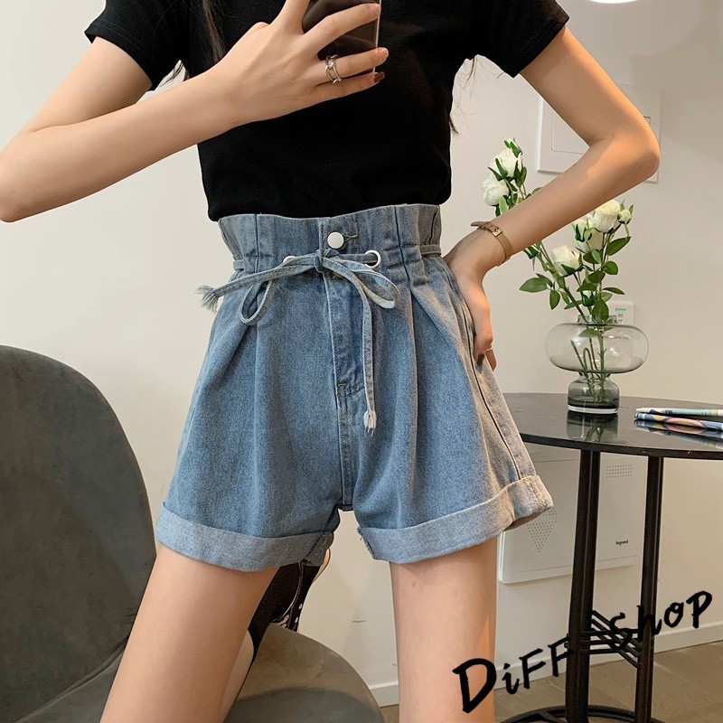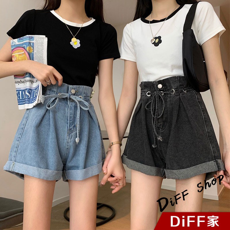 【DIFF】韓版捲邊寬鬆高腰顯綁帶牛仔短褲 花苞短褲 A字短褲 休閒褲 休閒短褲 花苞褲 A字褲【P122】