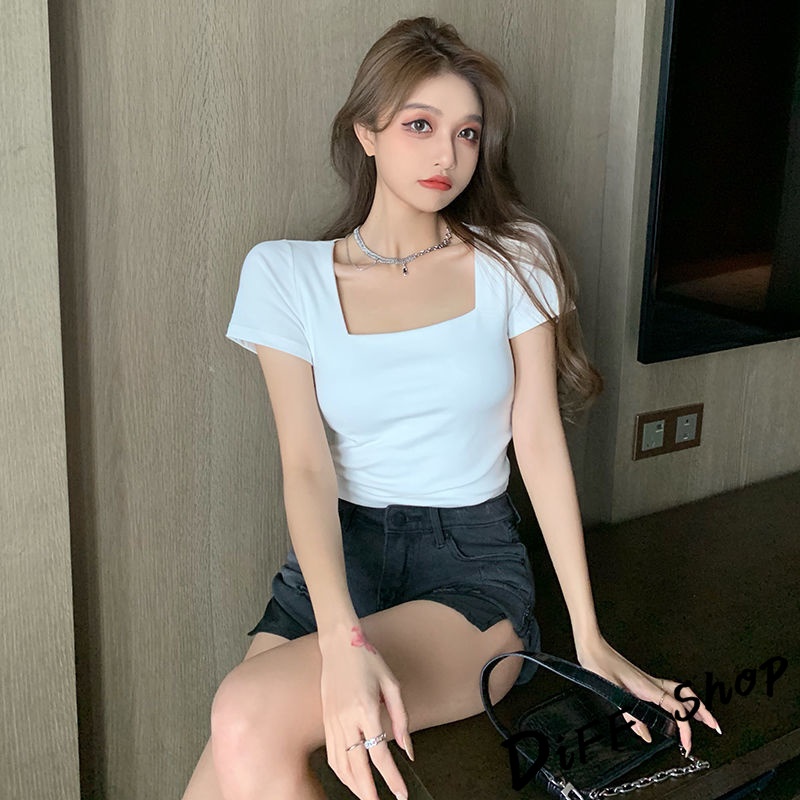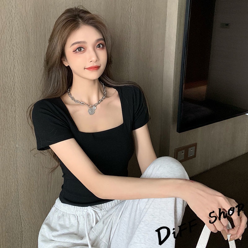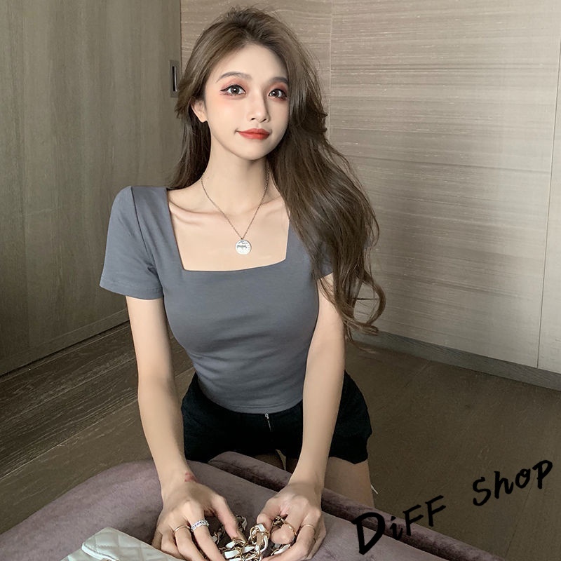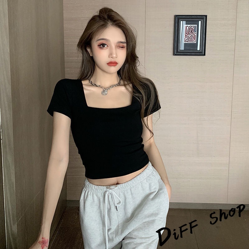 【DIFF】韓版方領設計感小眾短版小心機 短袖上衣 短袖t恤 女裝 顯瘦上衣 衣服 寬鬆上衣 素T 短版上衣【T355】