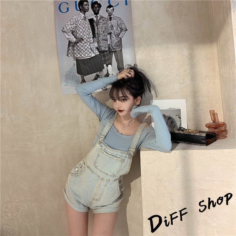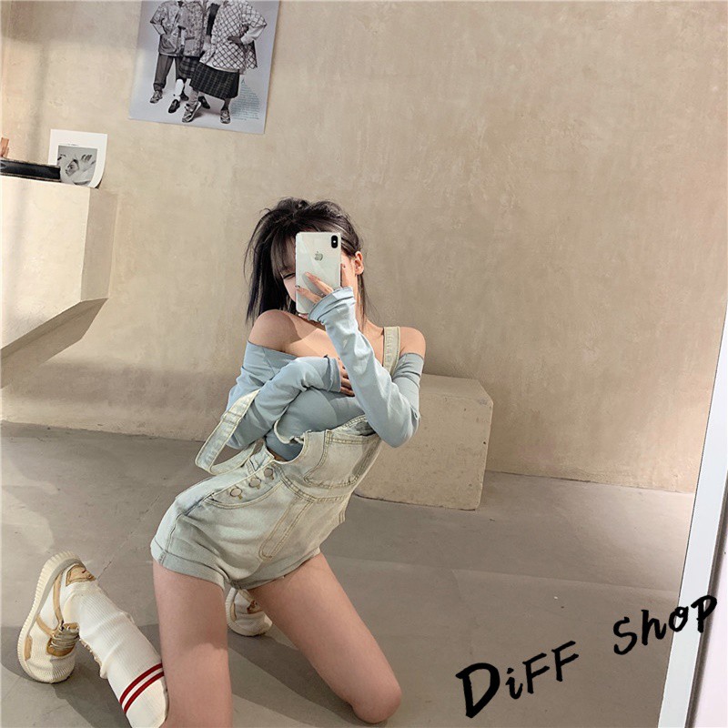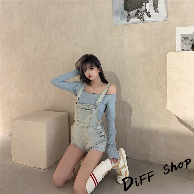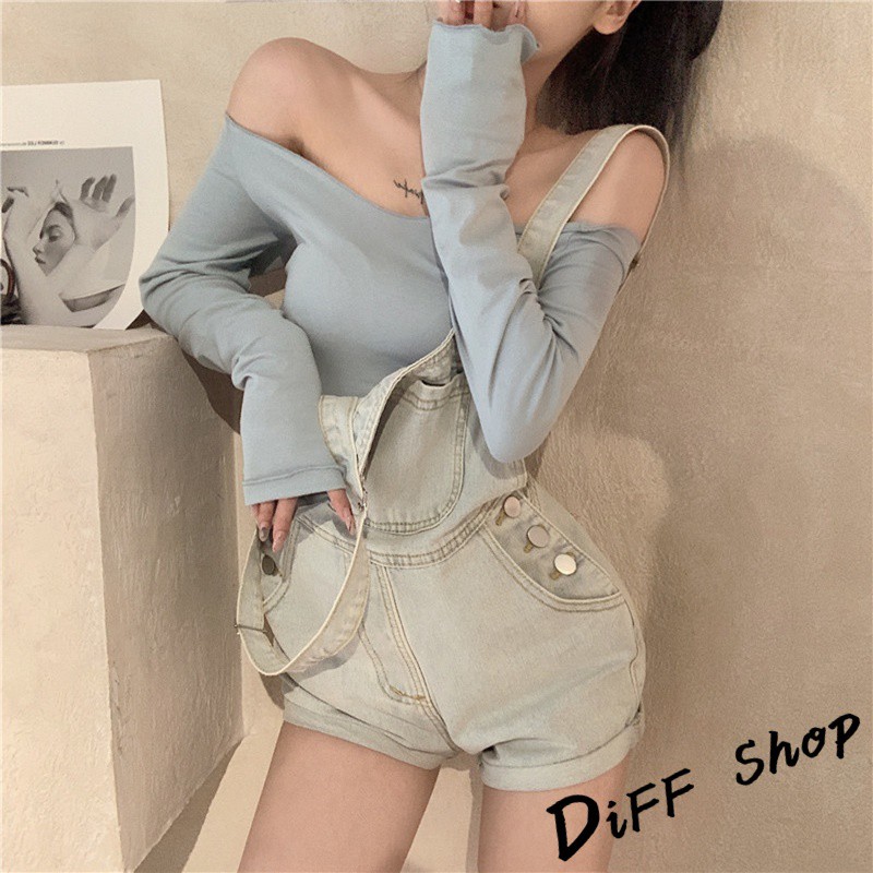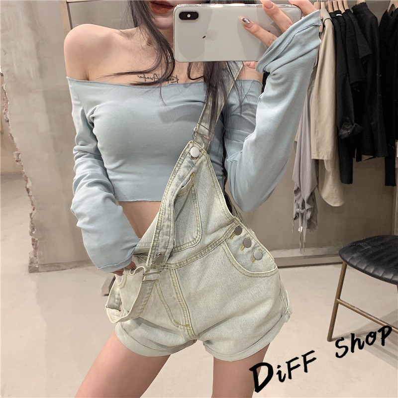 【DIFF】韓版復古淺色高腰顯瘦吊帶褲 吊帶短褲 一字領長袖上衣 褲子 吊帶褲 女裝【S121】