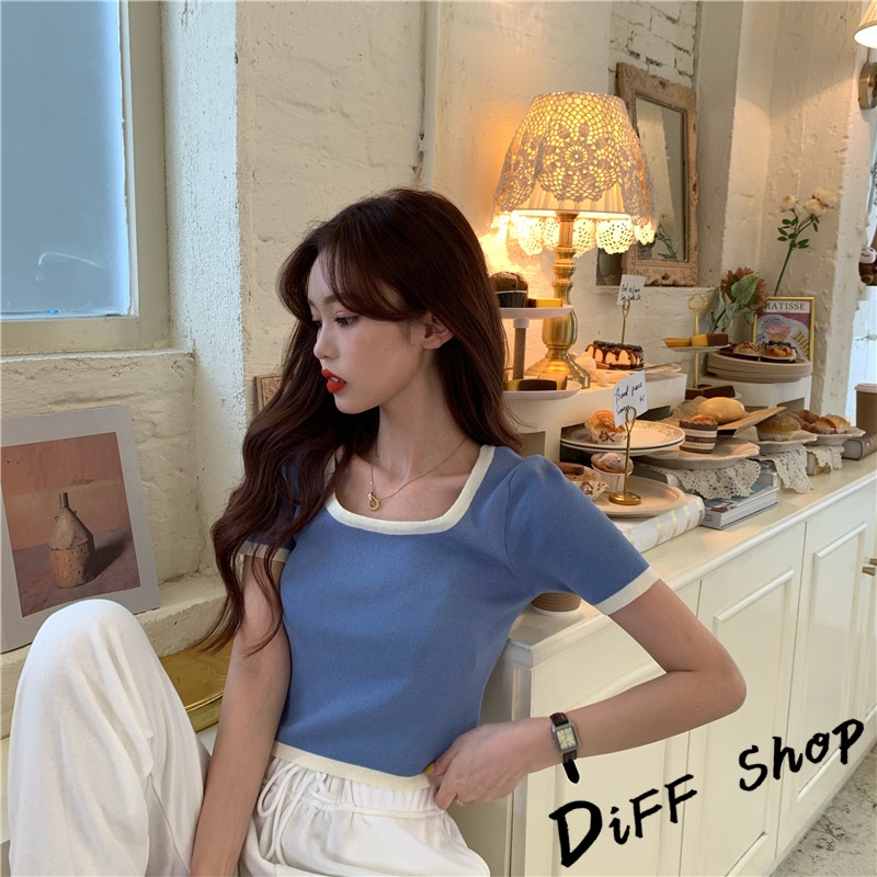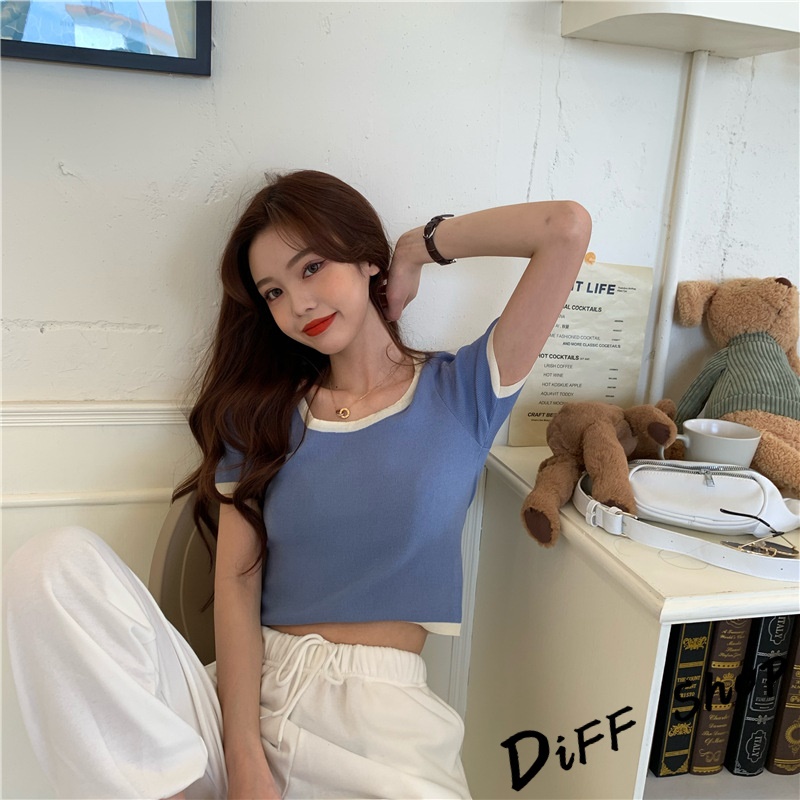【DIFF】韓版撞色修身冰絲短袖針織上衣 短版上衣 短袖上衣 短袖t恤 女裝 顯瘦上衣 衣服 素T 短板上衣【T374】