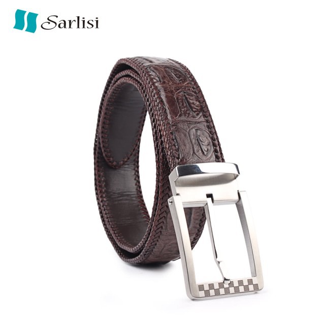 【台灣出貨】【Sarlisi】真皮針扣鱷魚皮帶男士腰帶手工編織包邊 咖啡色銀色鋼扣