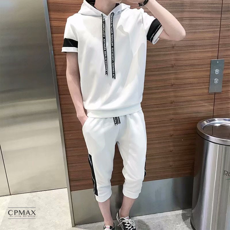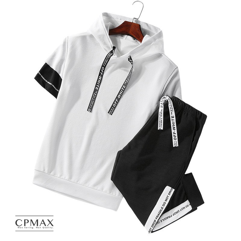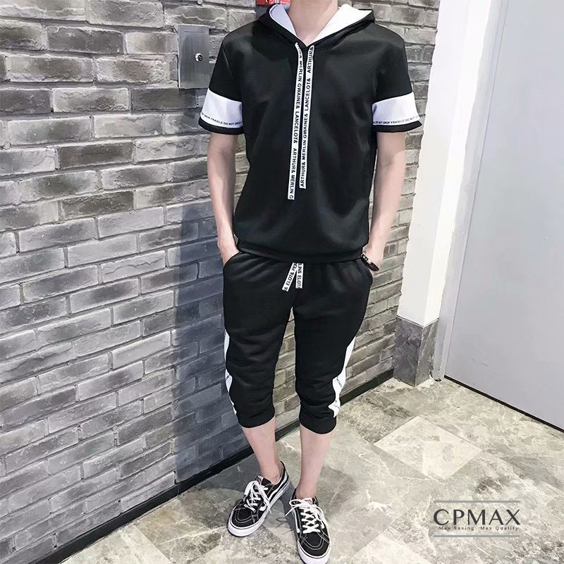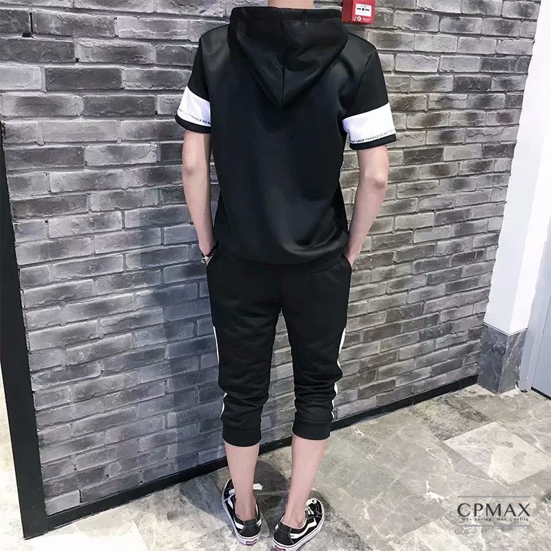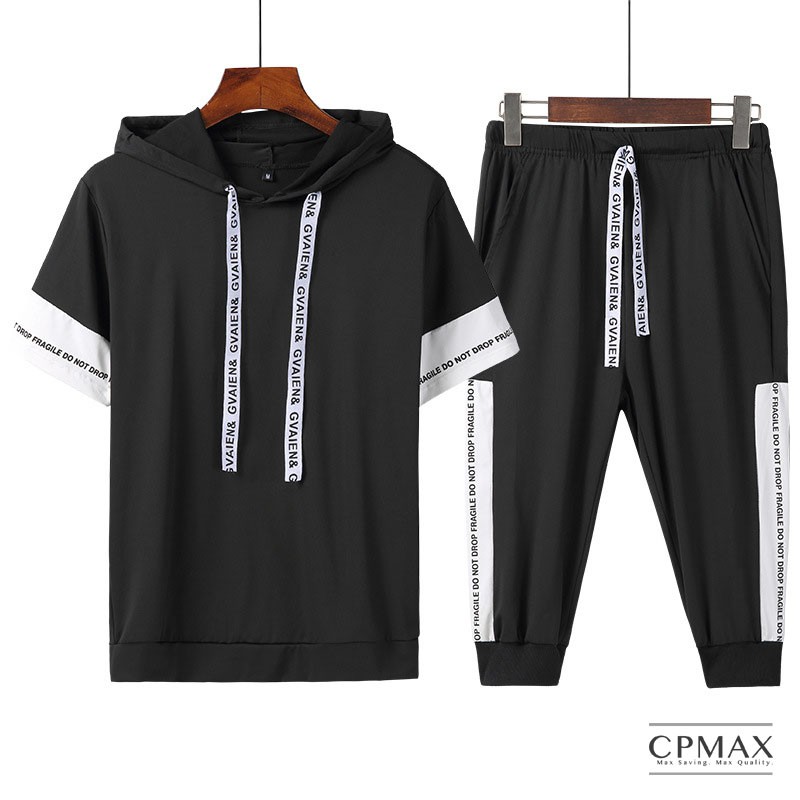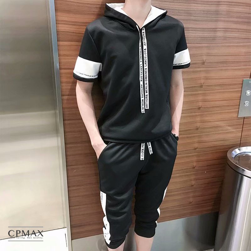 【CPMAX】男短T 男短褲 套賣 休閒套裝 韓系休閒運動連帽套裝 休閒縮口五分褲 黑白撞色字母織帶韓版設計款【O31】