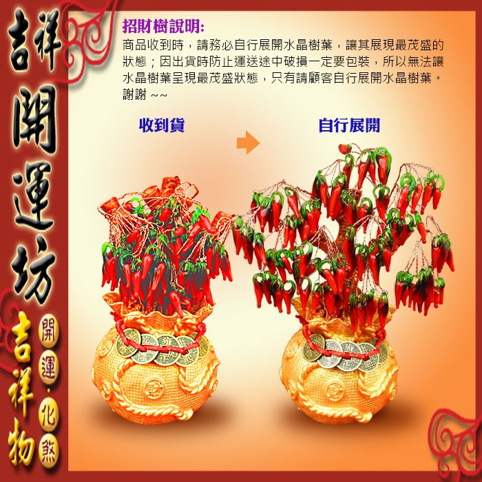 【吉祥開運坊】 招財系列【業績長紅 琉璃紅辣椒聚寶樹小型 特贈五帝錢)】開光擇日