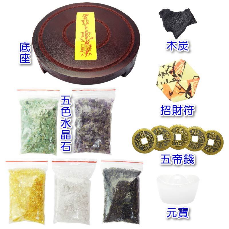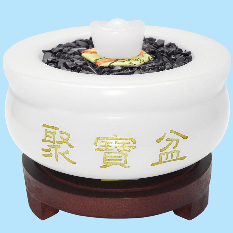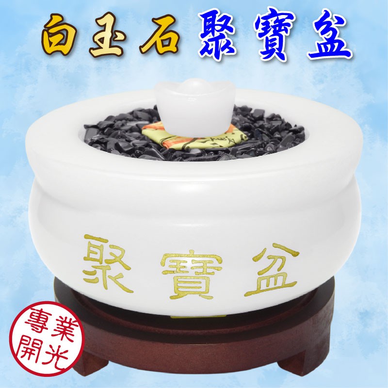 【吉祥開運坊】聚寶盆系列【白玉石聚寶盆中型 附五色石 五帝錢 元寶 木底座】開光 擇日