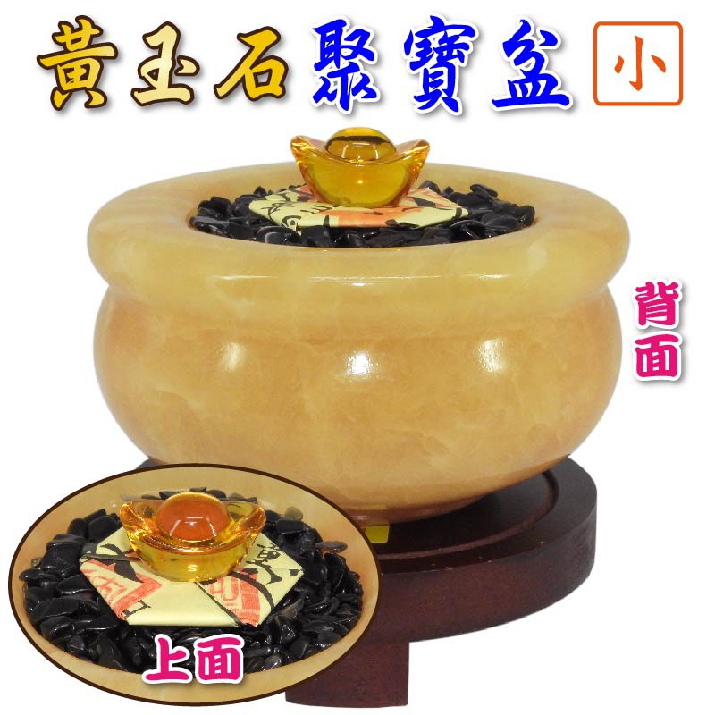 【吉祥開運坊】聚寶盆系列【黃玉石聚寶盆小型 附五色石 五帝錢 琉璃元寶 底座】開光 擇日