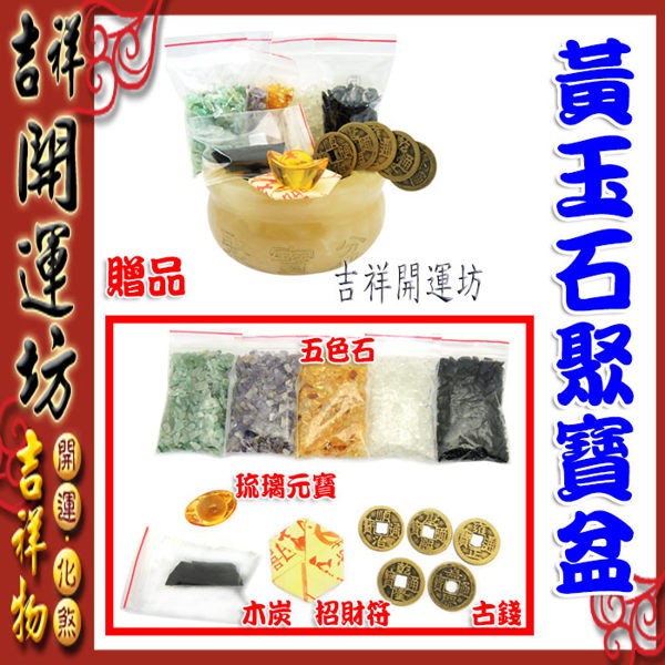 【吉祥開運坊】聚寶盆系列【黃玉石聚寶盆 小型 附五色石 五帝錢 琉璃元寶】開光 擇日