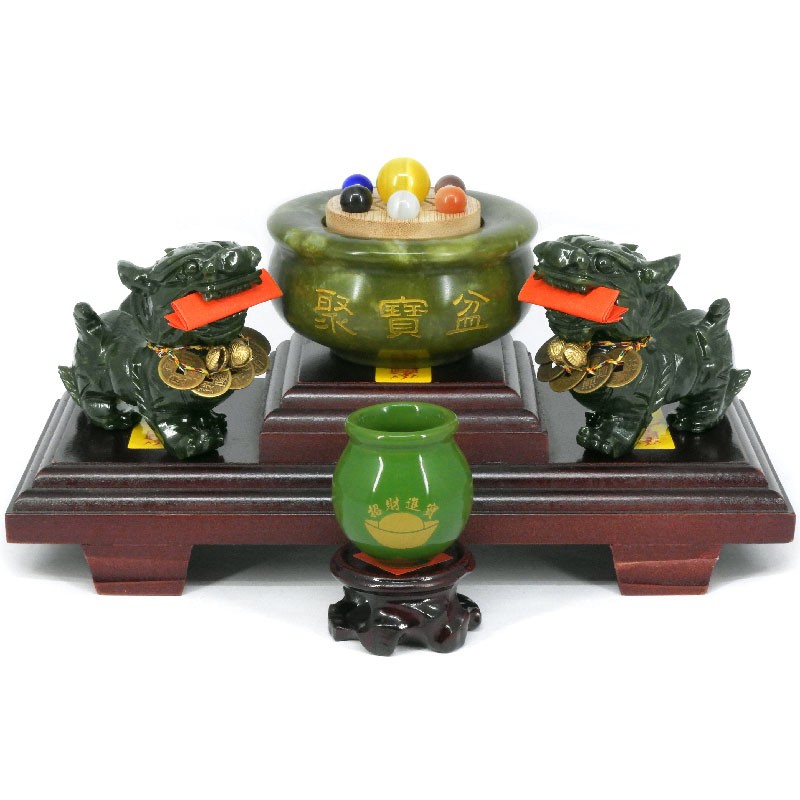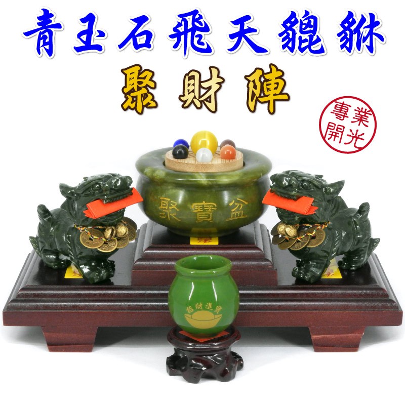 【吉祥開運坊】貔貅聚財陣【招財貔貅 青玉石貔貅 小型 聚寶盆 含特製木座】開光