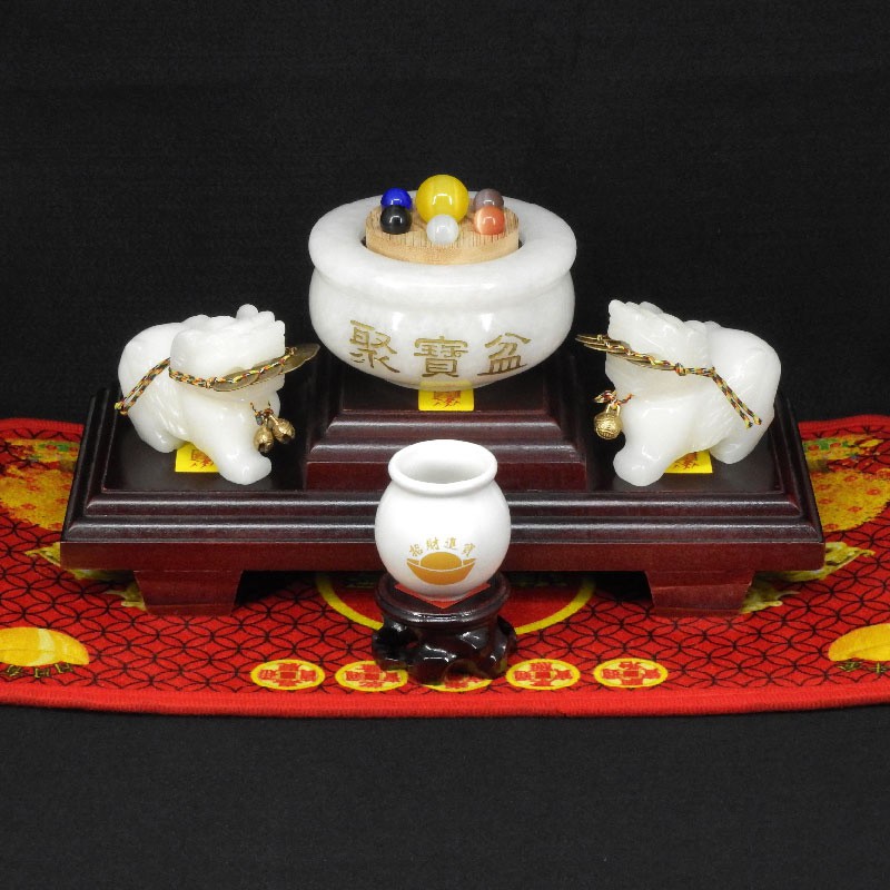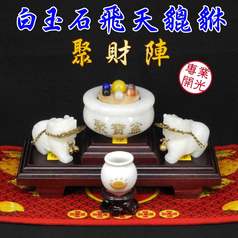 【吉祥開運坊】貔貅聚財陣【招財貔貅 白玉石貔貅小型 8cm 附七星聚寶盆 凸座 供杯 桌墊】開光 擇日