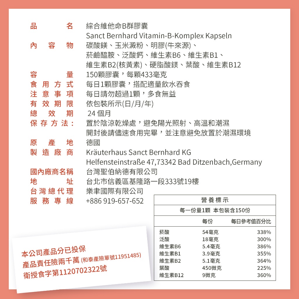 聖伯納德 Sanct Bernhard 綜合維他命B群 (150粒/罐) B群 葉酸-原 德國百年草本