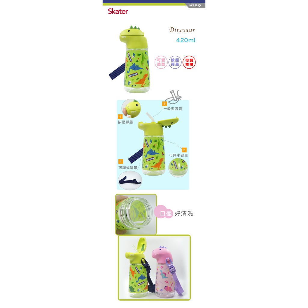 Skater 恐龍吸管水壺(420ml)-綠色/粉色【佳兒園婦幼館】
