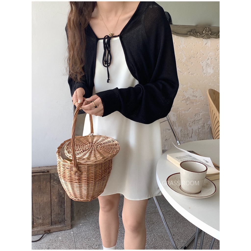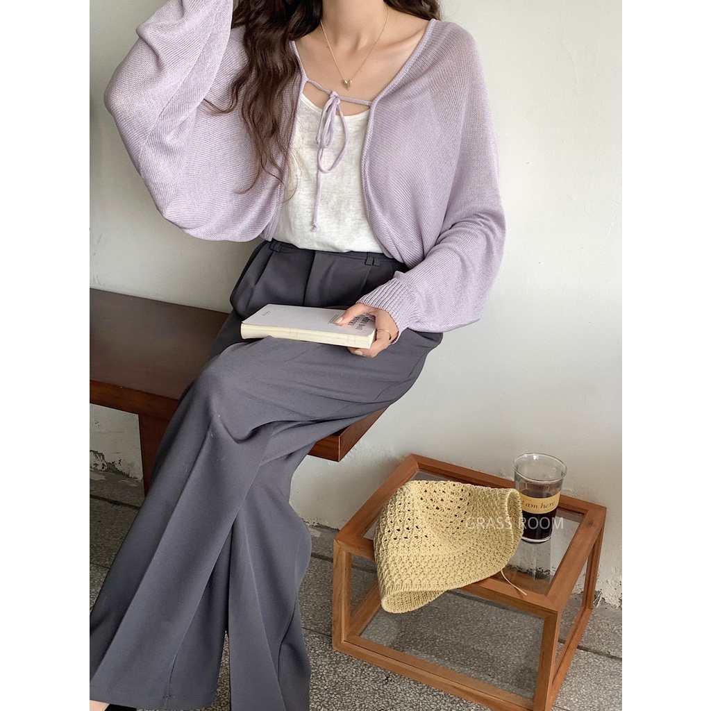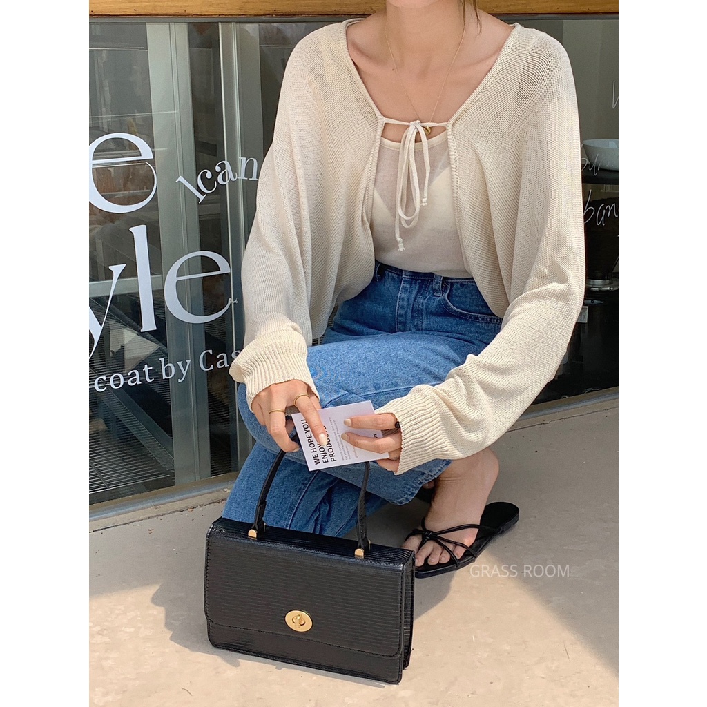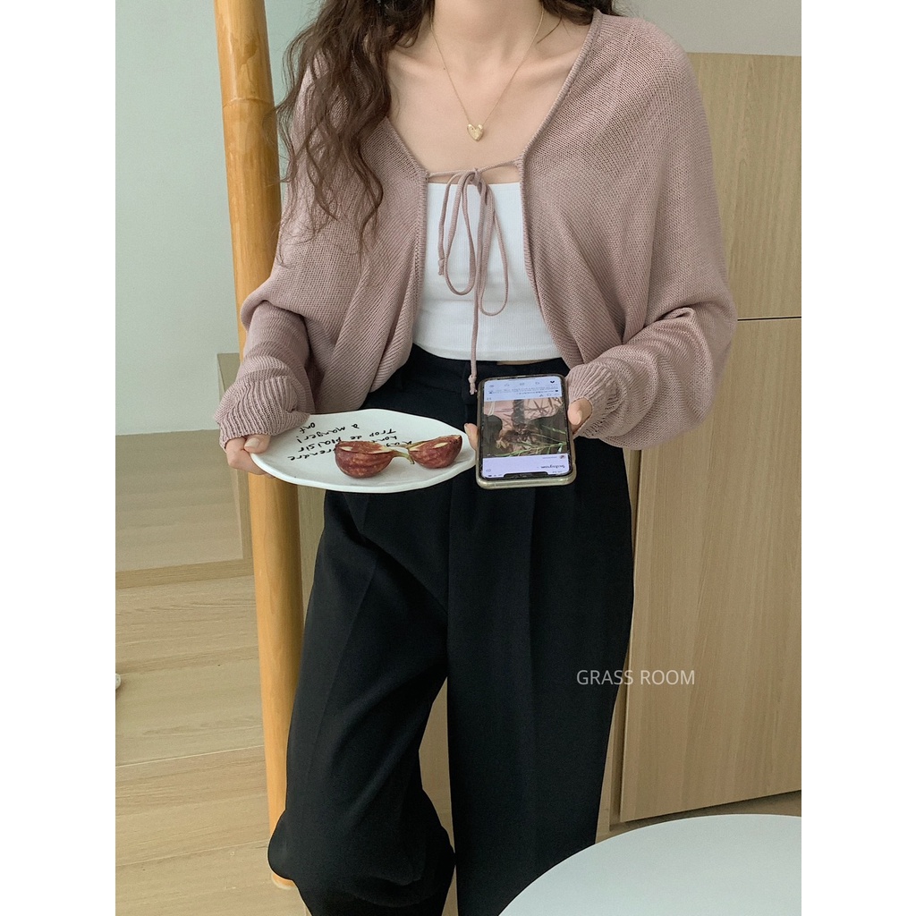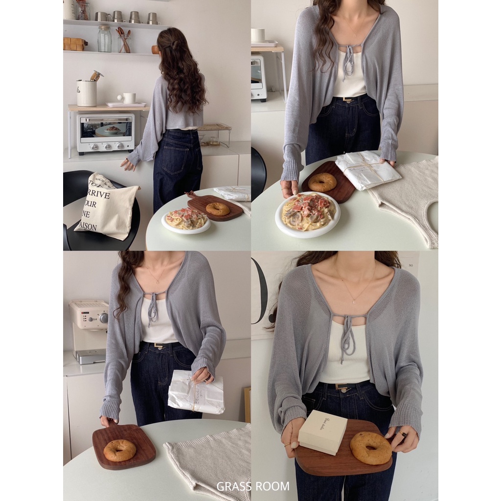 GRASS 浪漫來襲綁帶無領針織罩衫 短版無領針織衫 針織罩衫 綁帶針織衫 無領針織衫 針織外套 針織上衣 [A690]