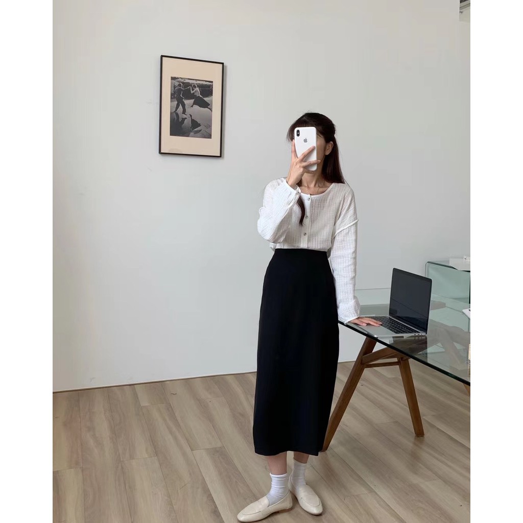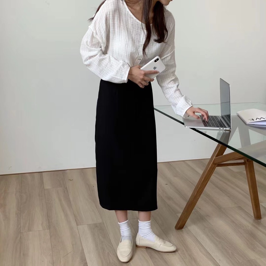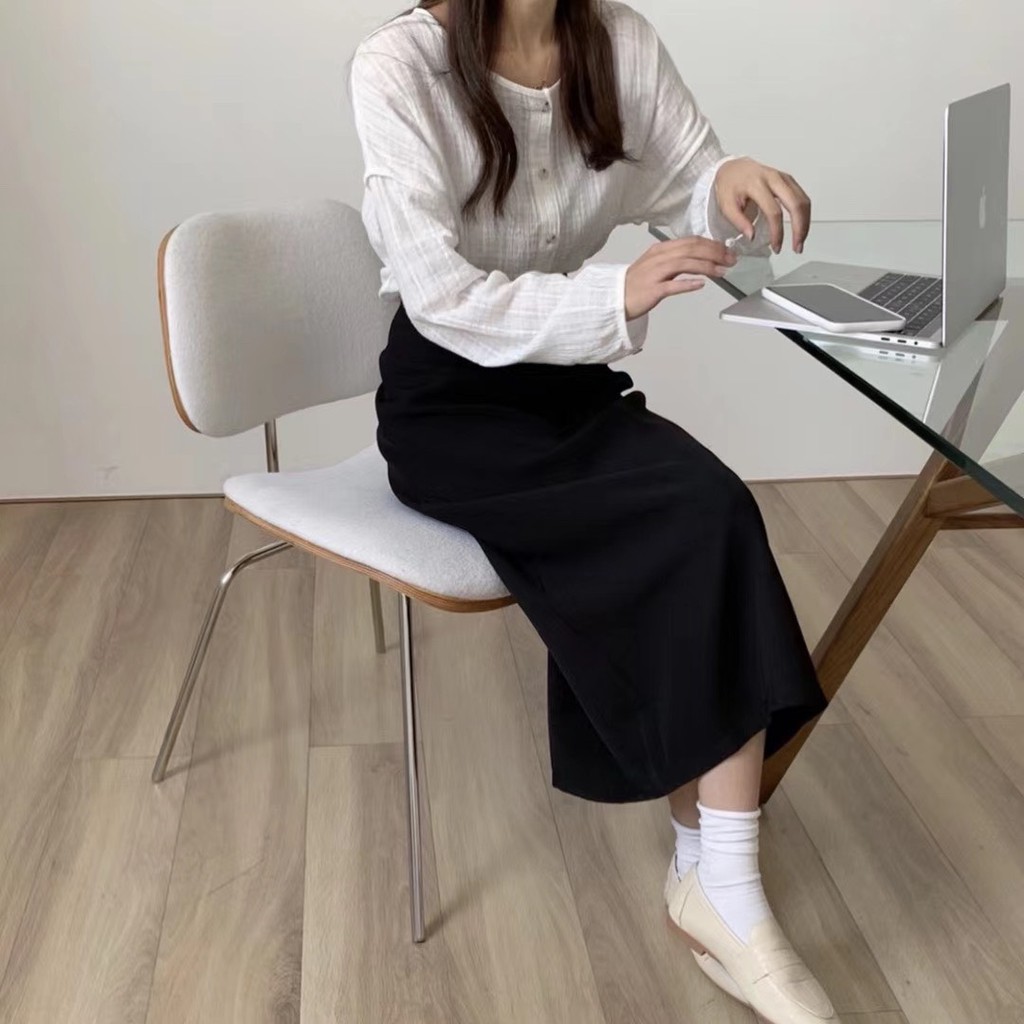百搭款直筒西裝雪紡裙 直筒裙 高腰裙 中長裙 開衩裙 裙子 雪紡西裝裙 長裙 高腰直筒裙GRASS [C7008]