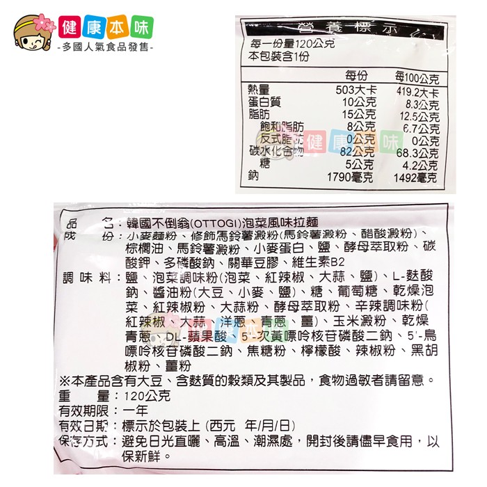 健康本味 韓國不倒翁OTTOGI泡菜風味拉麵120g 不倒翁 泡菜 韓國泡麵 泡麵