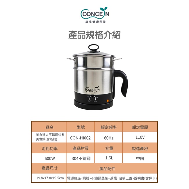 CONCERN康生 不鏽鋼快煮美食鍋(含蒸籠)1.6公升 CON-HI002 304不鏽鋼 電火鍋 全新現貨