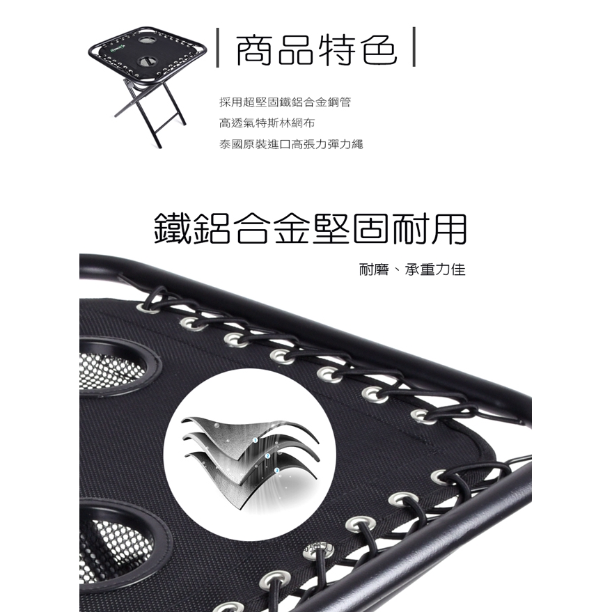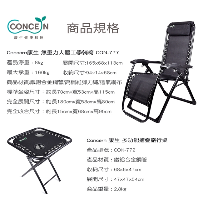 CONCERN康生 無重力人體工學躺椅(黑管)+多功能摺疊旅行桌 CON-777+CON-772