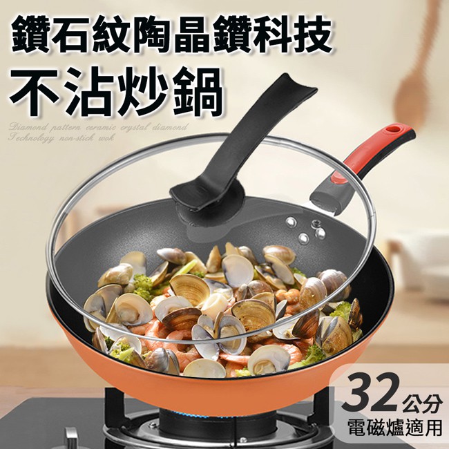 陶晶鑽鑽石紋科技不沾炒鍋32公分K0155/含鍋蓋/鍋子/單柄/炒鍋/煎鍋/不沾鍋/炒菜鍋/瓦斯爐電磁爐